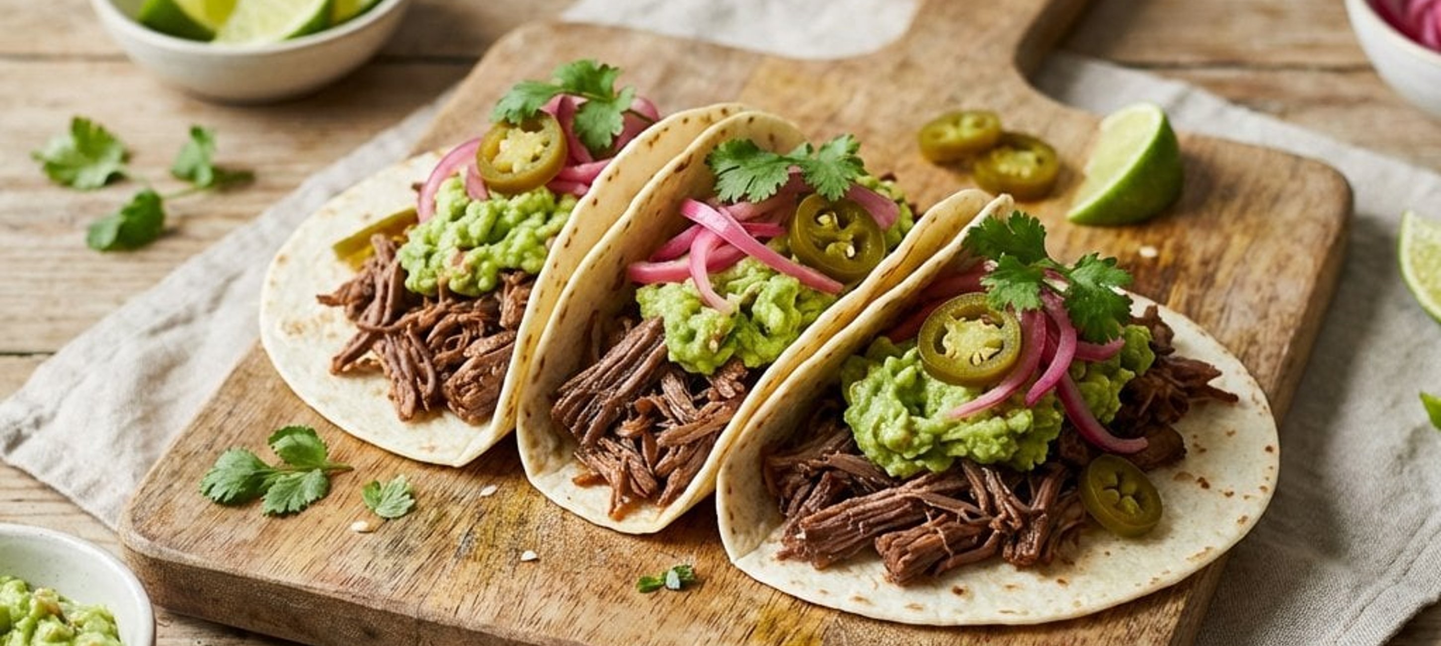 - 2Die Tortilla-Fladen oder Taco Shells kurz erwärmen und großzügig mit Guacamole bestreichen. Das Pulled Beef darauf verteilen.
