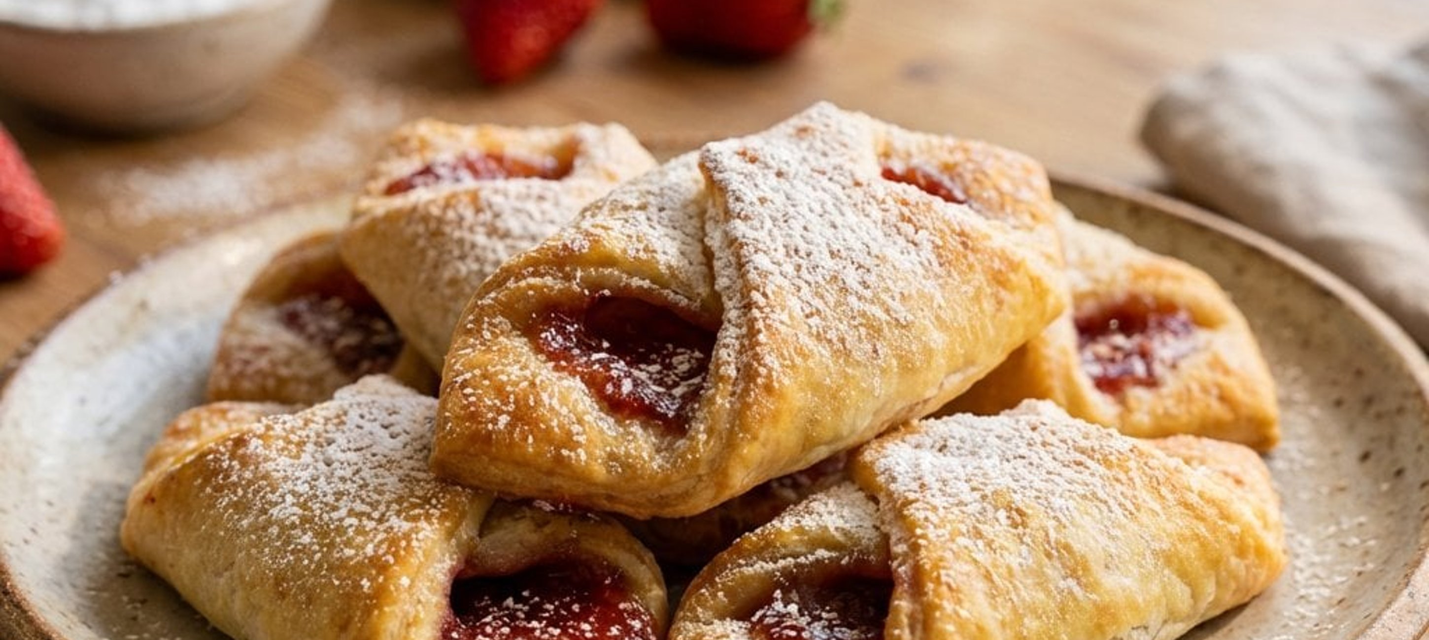 - 8Die fertigen Taschen abkühlen lassen, mit Puderzucker bestäuben und servieren.