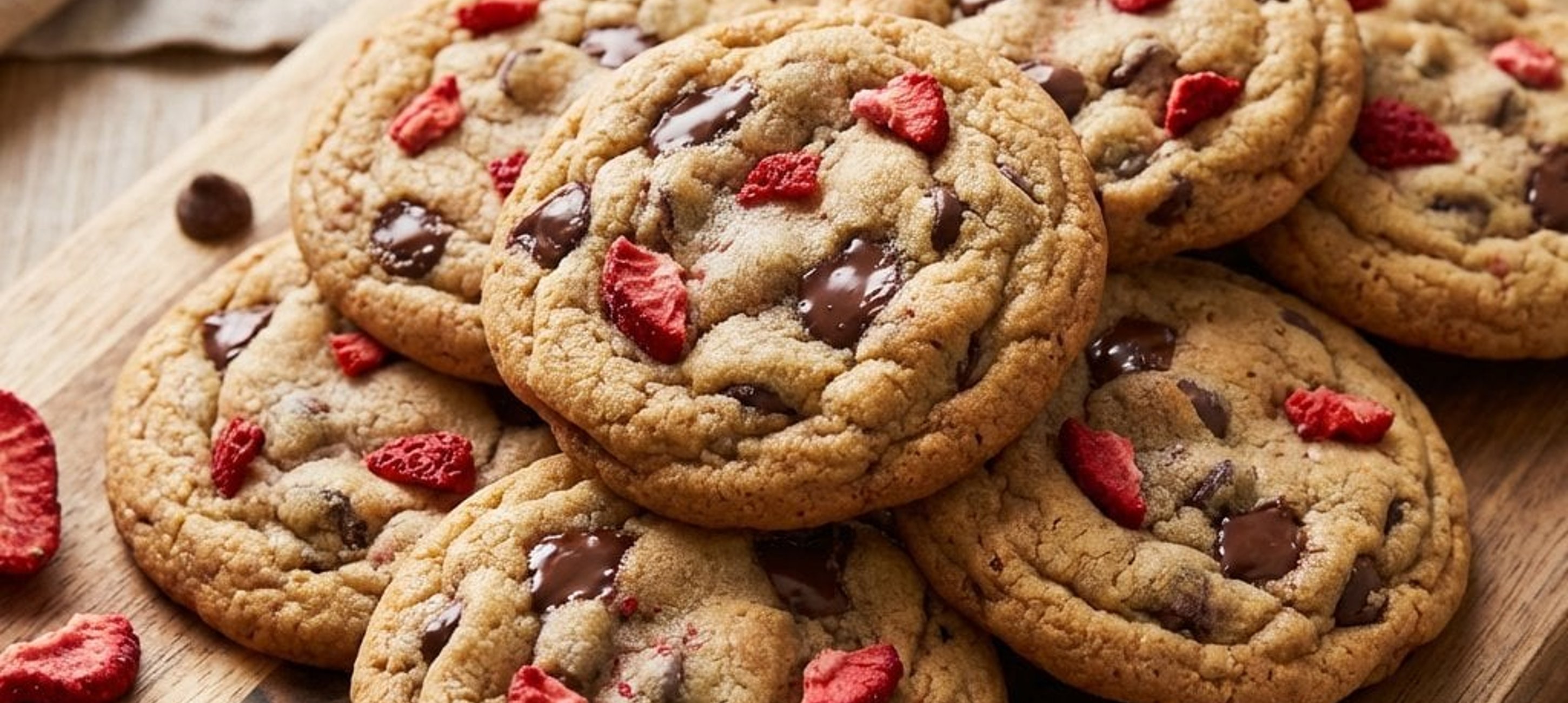 - 3Die Cookies kurz auf dem Blech abkühlen lassen, damit sie fest werden. Dann auf ein Kuchengitter legen und mit den zerbröselten gefriergetrockneten Erdbeeren bestreuen.