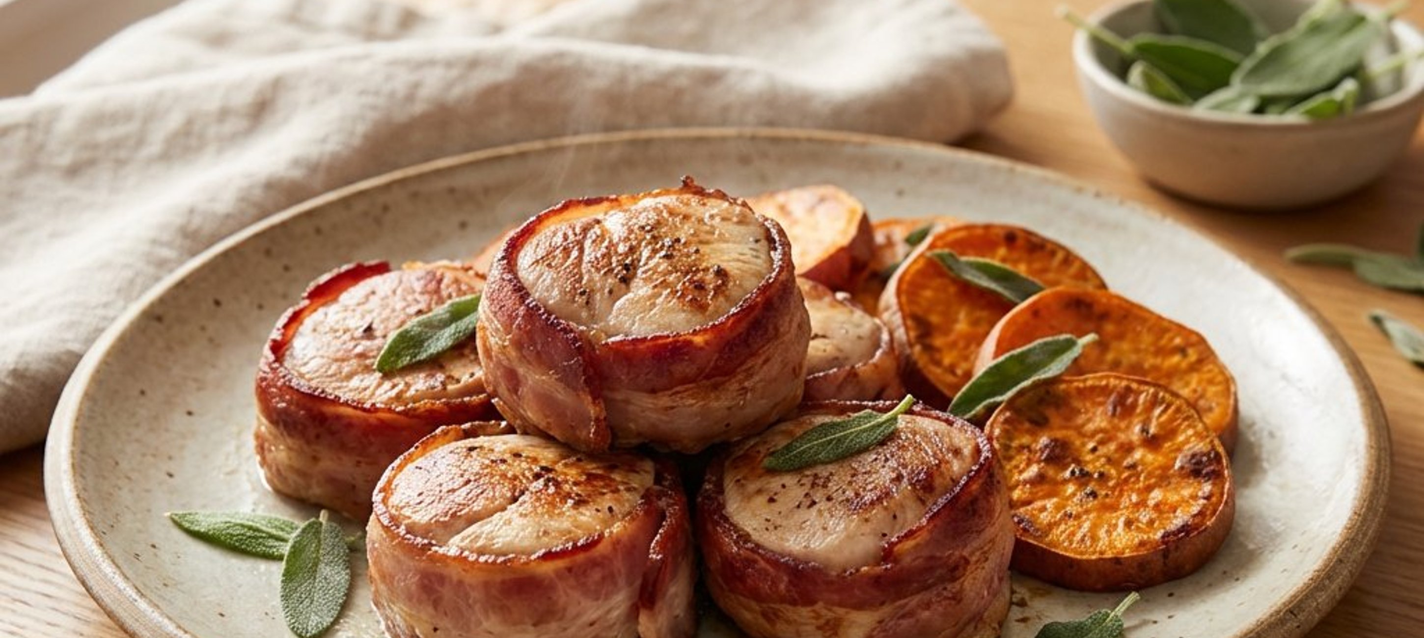 - 2Die Putenbrust in 8 Medaillons schneiden, diese einrollen und jeweils mit einer Scheibe Frühstücksspeck umwickeln. In einer heißen Pfanne scharf anbraten, bis der Speck knusprig ist.