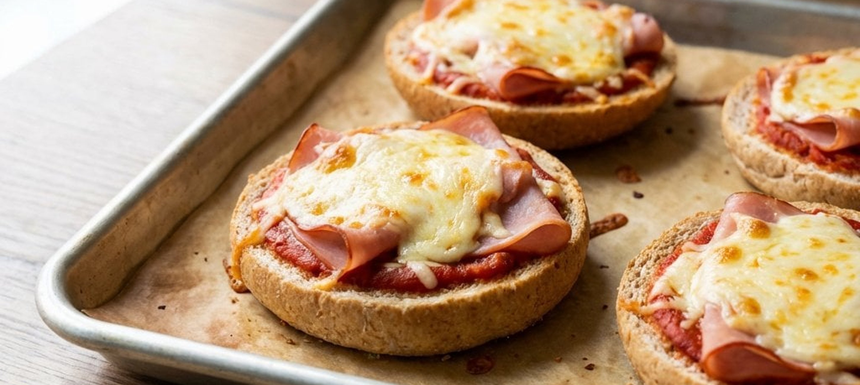 - 4Das Blech in den vorgeheizten Ofen schieben und die Mini-Pizzen ca. 6–7 Minuten backen, bis der Käse goldgelb geschmolzen und die Brötchen knusprig sind. Aus dem Ofen nehmen und sofort servieren.