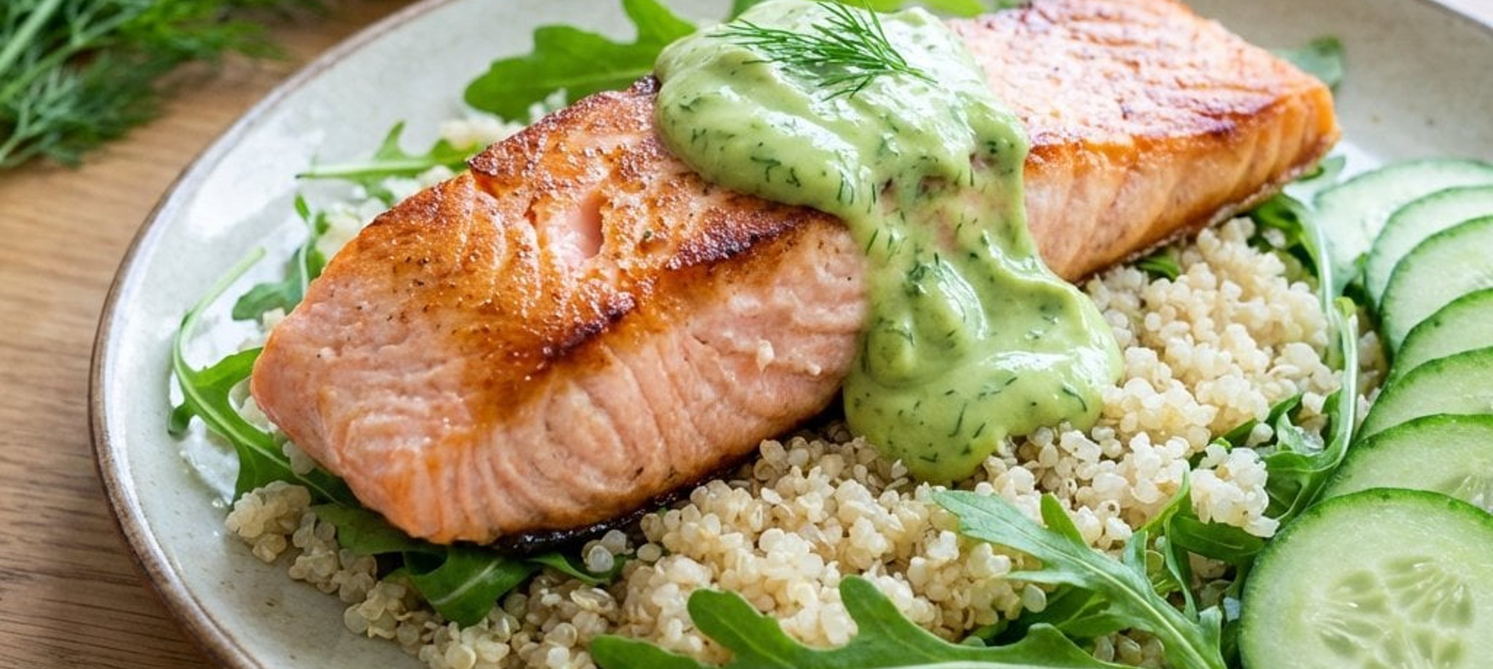 - 5Den gekochten Quinoa auf Tellern anrichten, den Rucola, das Lachsfilet und die Gurken darauf platzieren. Mit dem Avocado-Dip beträufeln oder den Dip in einer separaten Schale dazu servieren.