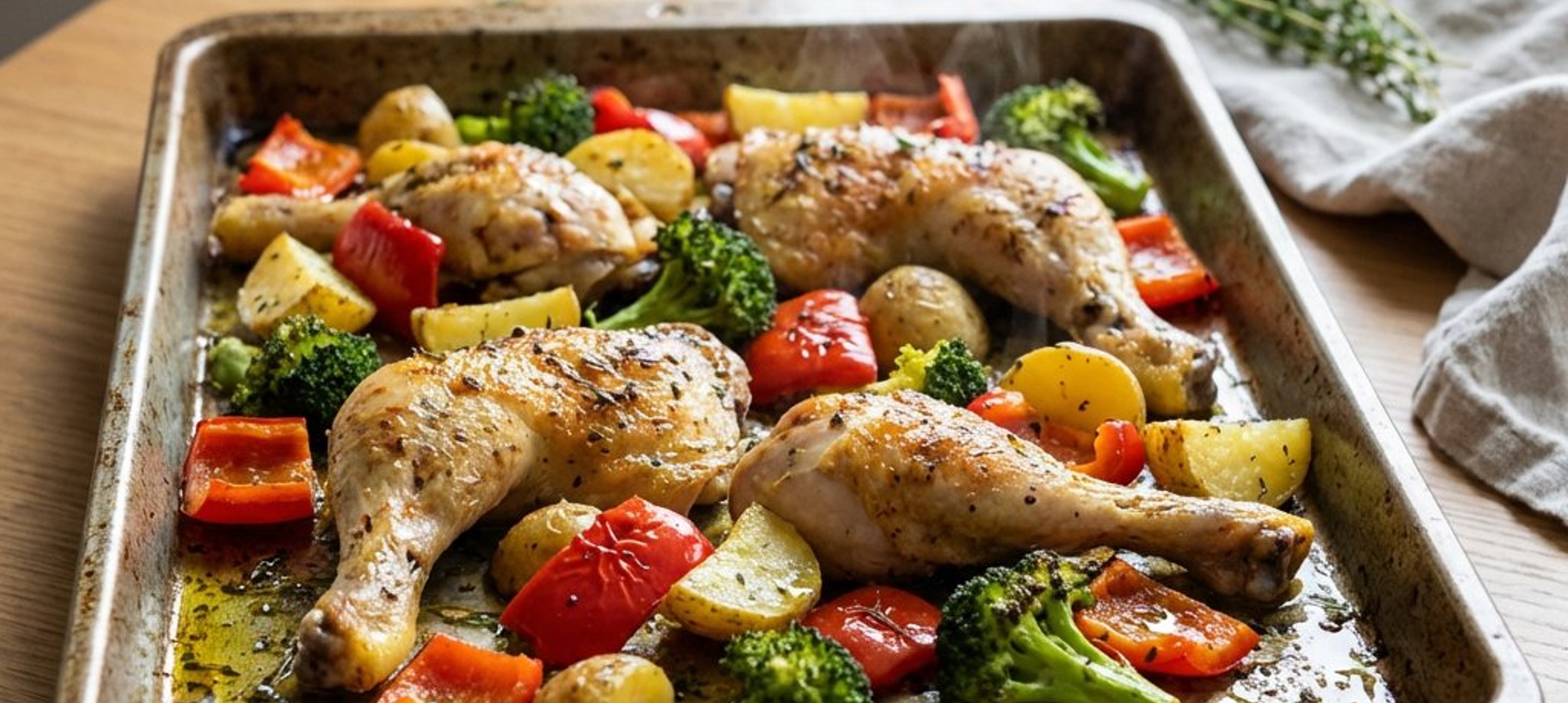- 4Nach 15 Minuten das Blech aus dem Ofen nehmen. Zwiebeln, Paprika und die Knoblauchhälften (mit der Schnittfläche nach unten) zu den Kartoffeln geben. Alles leicht salzen, mit dem restlichen EL Rapsöl beträufeln und die Hähnchenteile darauf verteilen. Zurück in den Ofen schieben und weitere 30 – 40 Minuten bei 190 – 200 °C garen.