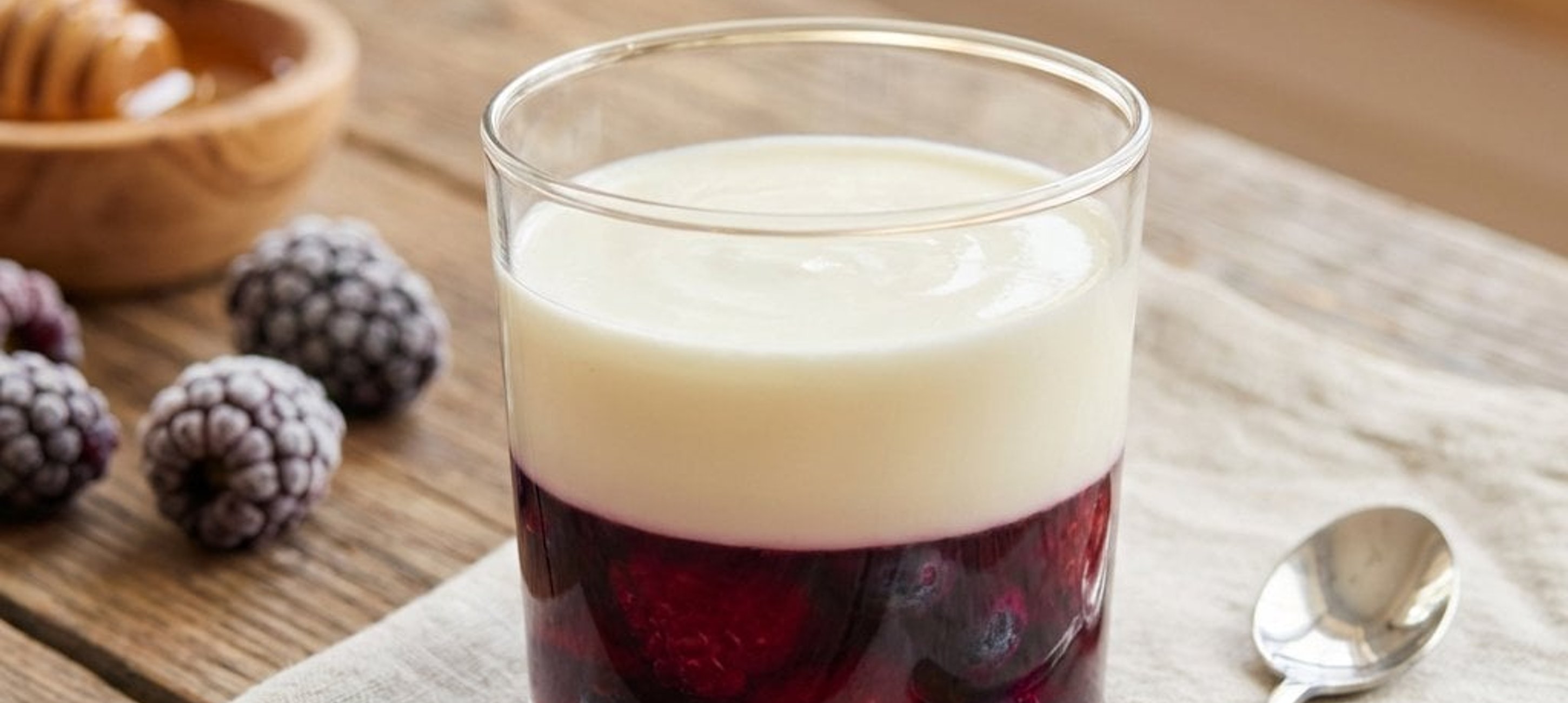 - 2Verrühren Sie in einer Schüssel den Naturjoghurt with dem restlichen 1 Esslöffel Honig. Erhitzen Sie die Milch-Gelatine-Mischung bei niedriger Hitze für 1–2 Minuten, bis die Gelatine gelöst ist.