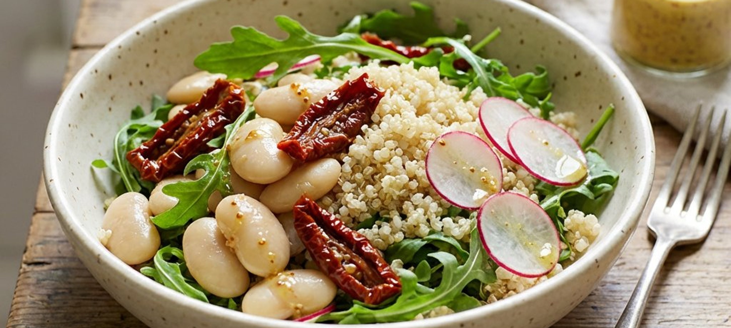 - 1Die Wachtelbohnen in einem Sieb abspülen und abtropfen lassen. Die getrockneten Tomaten in kleine Stücke schneiden. Die Radieschen und die rote Zwiebel in feine Scheiben schneiden. Den Rucola waschen und trocken schütteln.