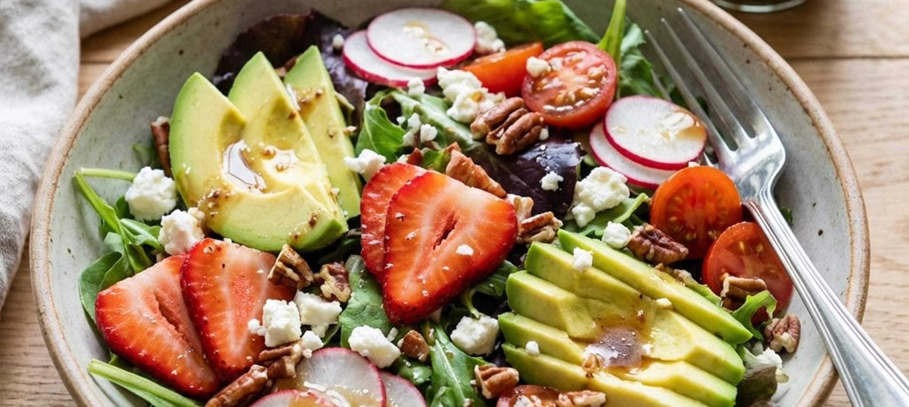 - 2Den Salat-Mix zusammen mit dem vorbereiteten Gemüse, den Erdbeeren und dem Großteil des Fetas in eine große Schüssel geben. Für das Dressing Olivenöl, Rotweinessig, Honig und eine Prise Salz in einer kleinen Schüssel glatt rühren. Das Dressing über den Salat gießen und alles vorsichtig vermengen. Den Salat auf Tellern anrichten und mit dem restlichen Feta sowie den gehackten Pekannüssen bestreut servieren.