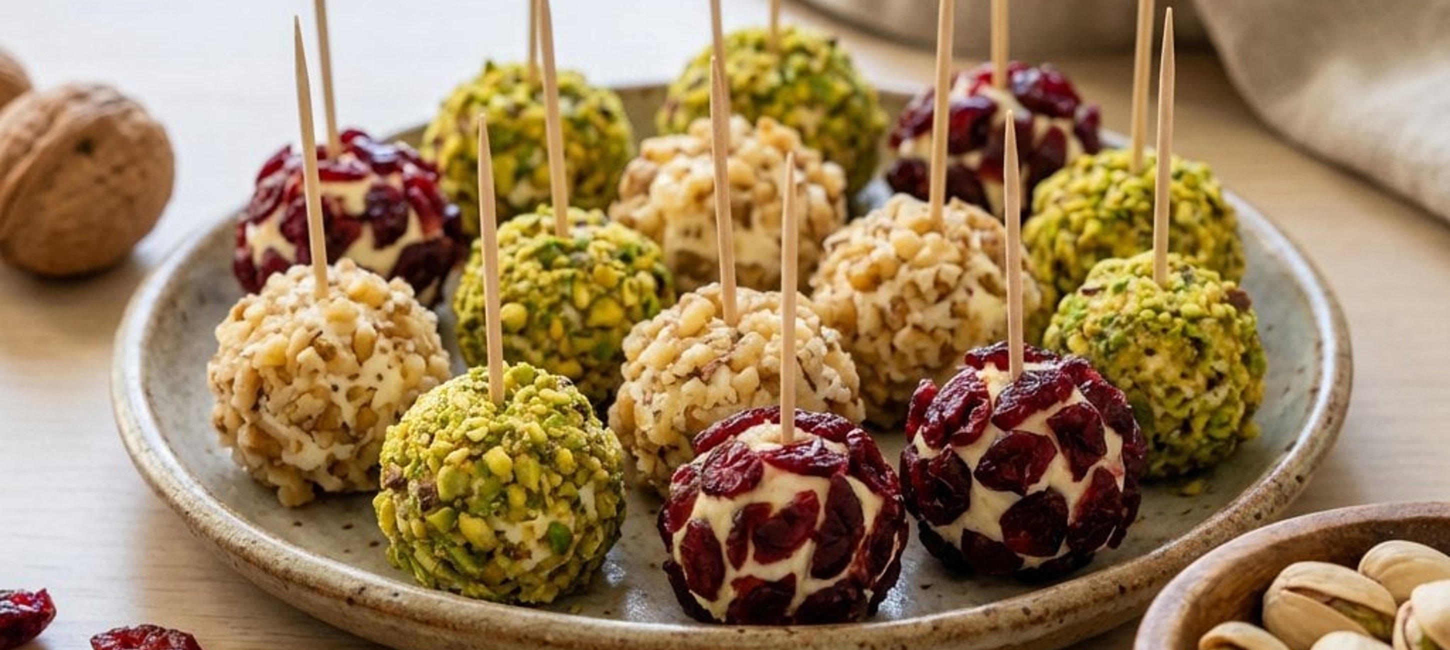 - 5Die Bällchen nacheinander in den gehackten Pistazien, Walnüssen oder Cranberries wälzen, sodass sie rundherum gleichmäßig bedeckt sind.