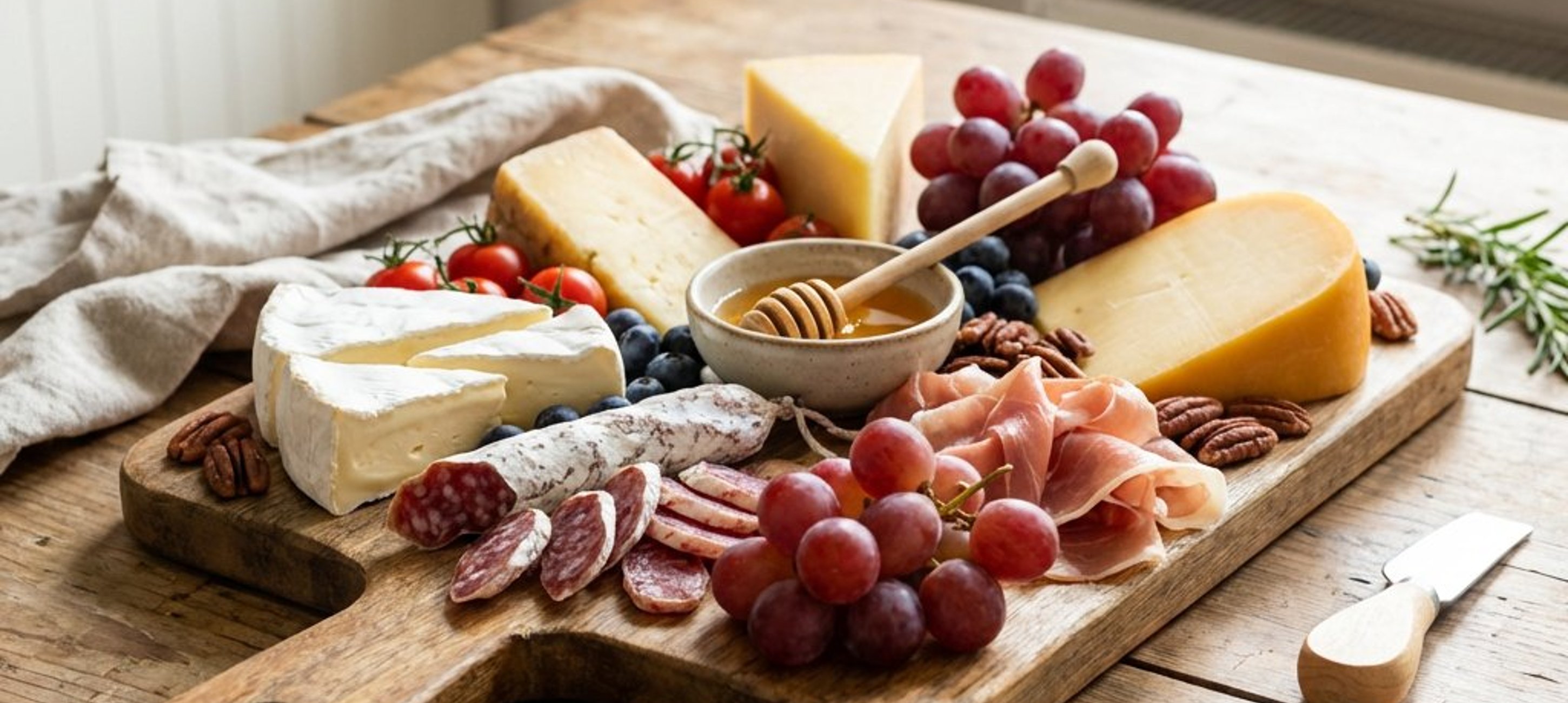 - 5Die restlichen Zutaten (Käse, Wurst, Tomaten) dekorativ auf der Platte verteilen. Die entstandenen Lücken mit den Weintrauben, Blaubeeren und Pekannüssen auffüllen.