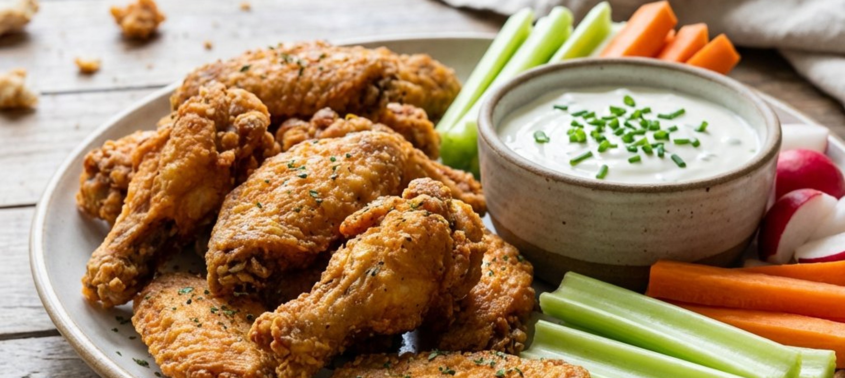 Servieren Sie die Flügel heiß, damit sie ihre maximale Knusprigkeit behalten. Die Gemüsesticks können Sie nach Belieben variieren – auch Paprika oder Gurke passen hervorragend dazu.