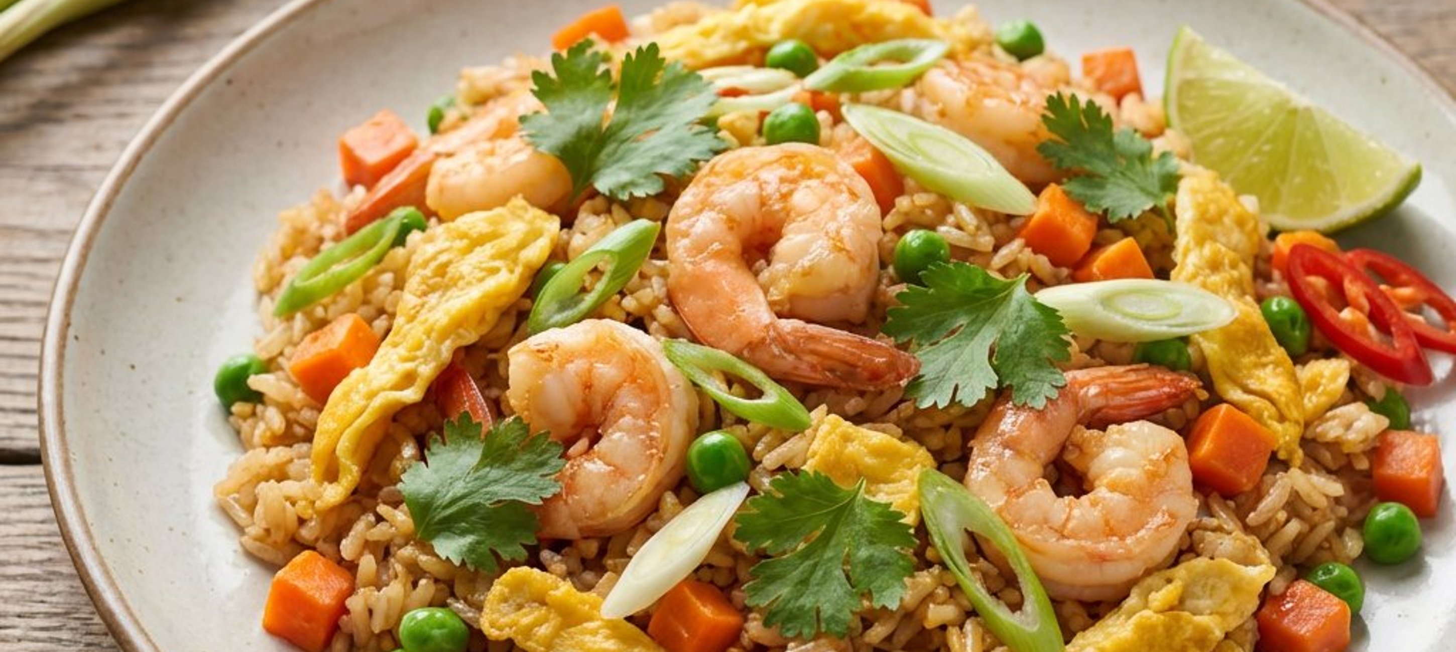 - 5Zum Schluss Garnelen, Rührei, Koriander und den restlichen Lauch unterheben. Alles noch eine Minute gemeinsam erhitzen. Mit frischen Frühlingszwiebeln, Koriander und nach Belieben mit Chiliringen garniert servieren. Dazu passen extra Limettenspalten.