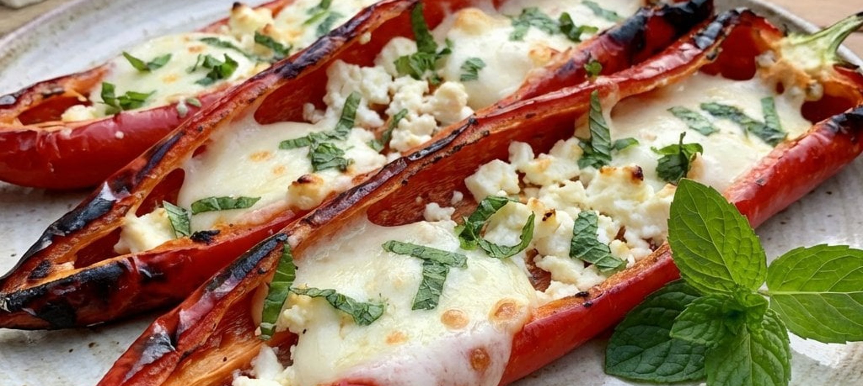 - 2Den Mozzarella abtropfen lassen und in ca. 1 cm große Würfel schneiden. Den Feta zerbröseln. Die Minzblätter von den Stielen zupfen und grob hacken. Käse und Minze vermengen, bei Bedarf leicht nachsalzen und die Paprikahälften mit der Mischung füllen.
