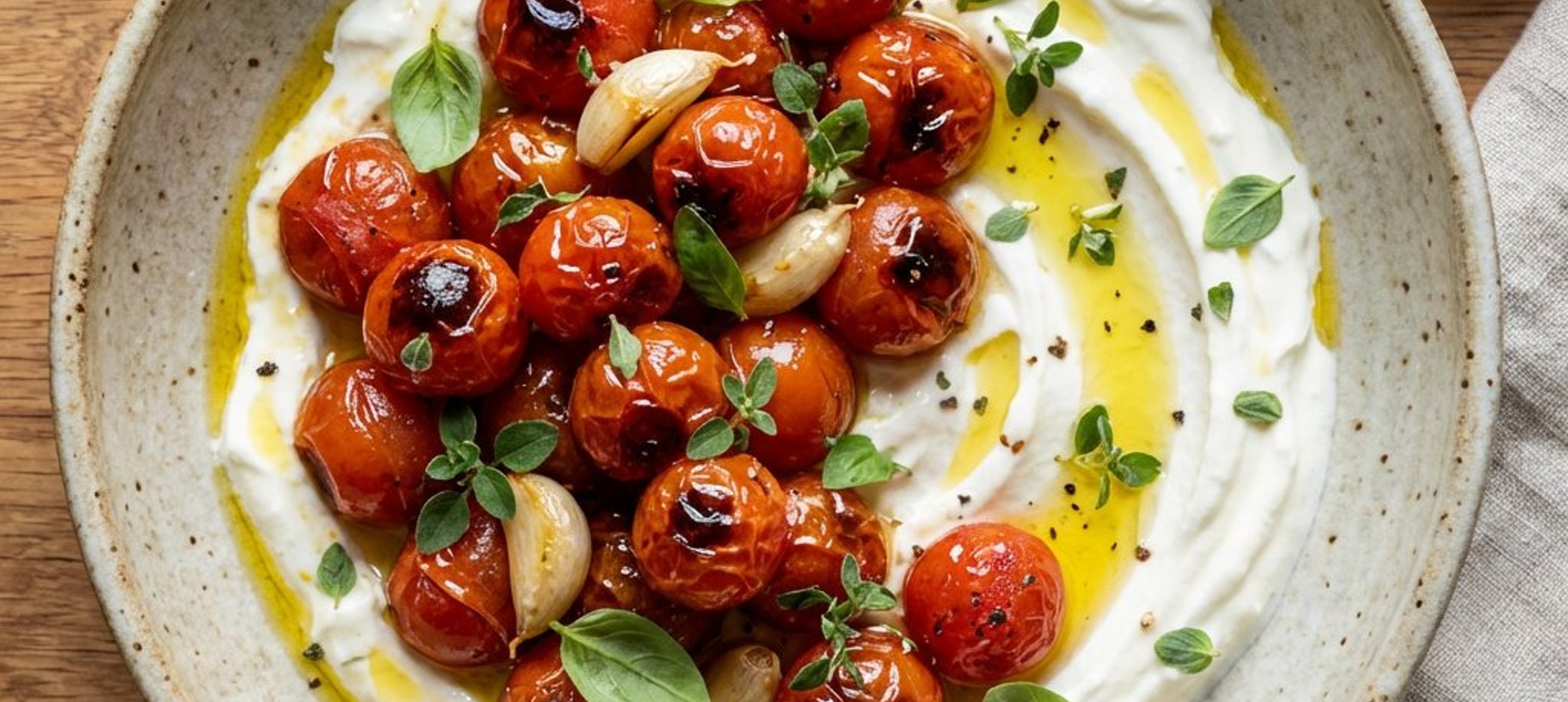 - 3Verteilen Sie den griechischen Joghurt auf zwei Schüsseln. Geben Sie die gerösteten Tomaten darauf. Drücken Sie die weichen Knoblauchzehen aus ihrer Schale direkt auf den Joghurt (3 Zehen pro Schüssel). Träufeln Sie den restlichen Saft aus der Auflaufform darüber und servieren Sie das Gericht warm. Garnieren Sie alles mit frischem Basilikum und Oregano.