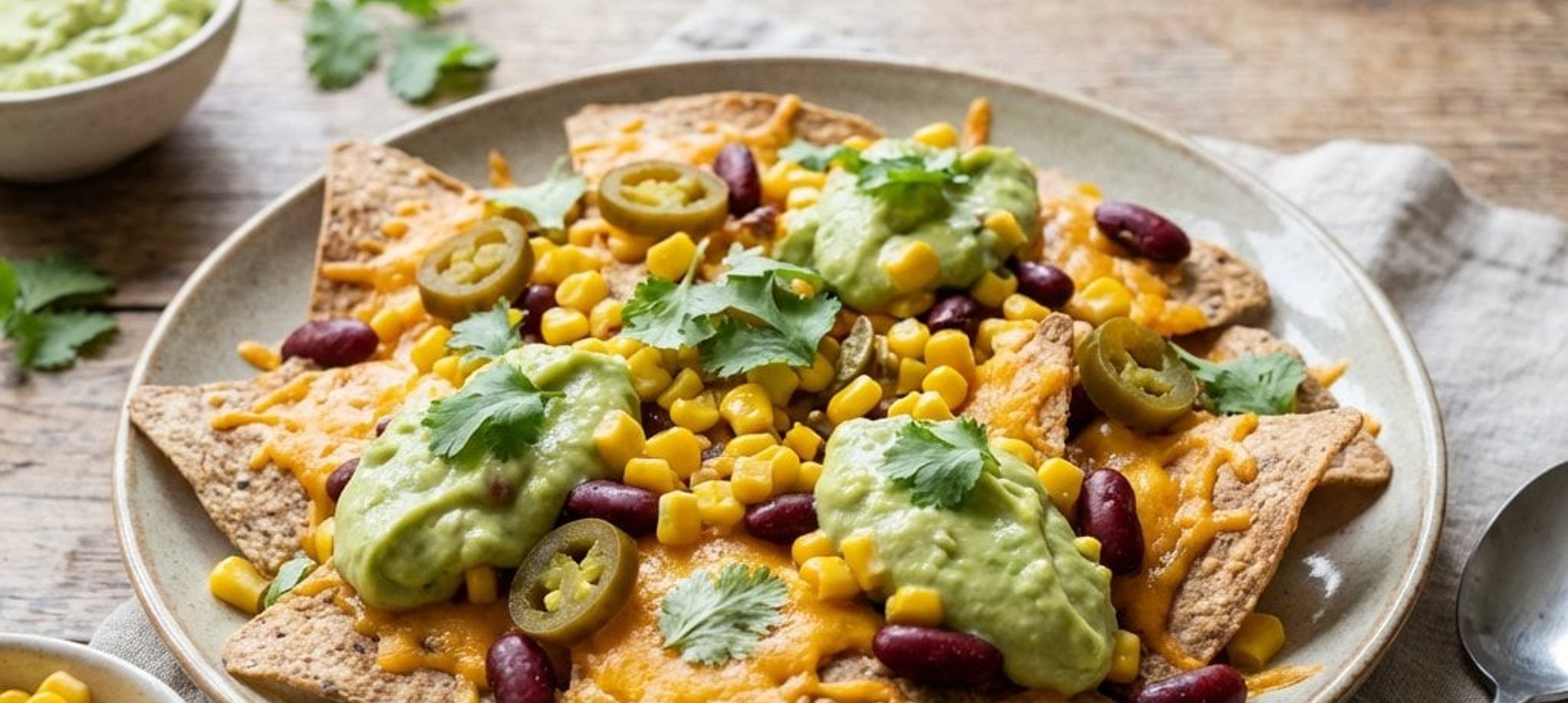 - 2Das Blech aus dem Ofen nehmen. Die warmen Tortilla-Chips auf Tellern anrichten. Sofort mit fein geriebenem Cheddar bestreuen, damit dieser leicht schmilzt. Den Avocado-Dip, Mais, abgetropfte Kidneybohnen und Jalapeños darauf verteilen. Mit frischem Koriander garnieren und sofort servieren.