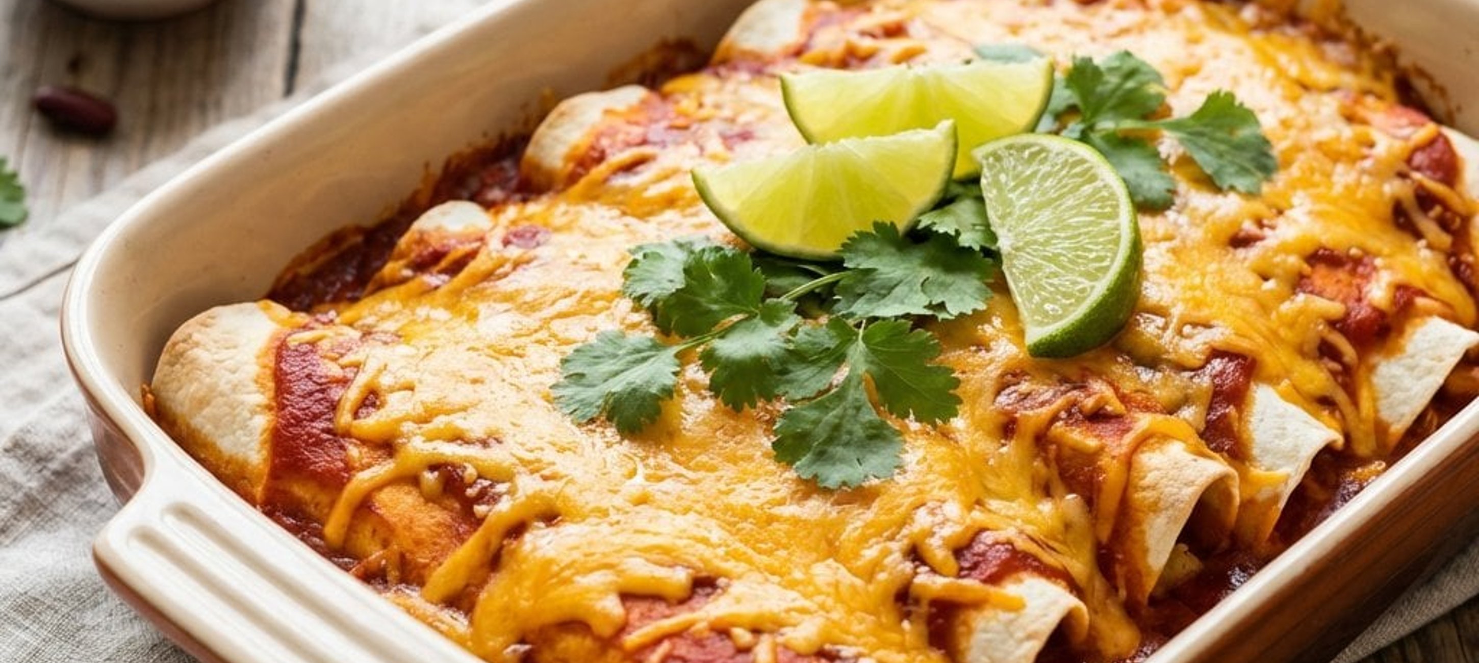 Servieren Sie die Enchiladas mit einem Klecks saurer Sahne, frischem Koriander, fein gewürfelten roten Zwiebeln und Limettenspalten für die perfekte Frische.