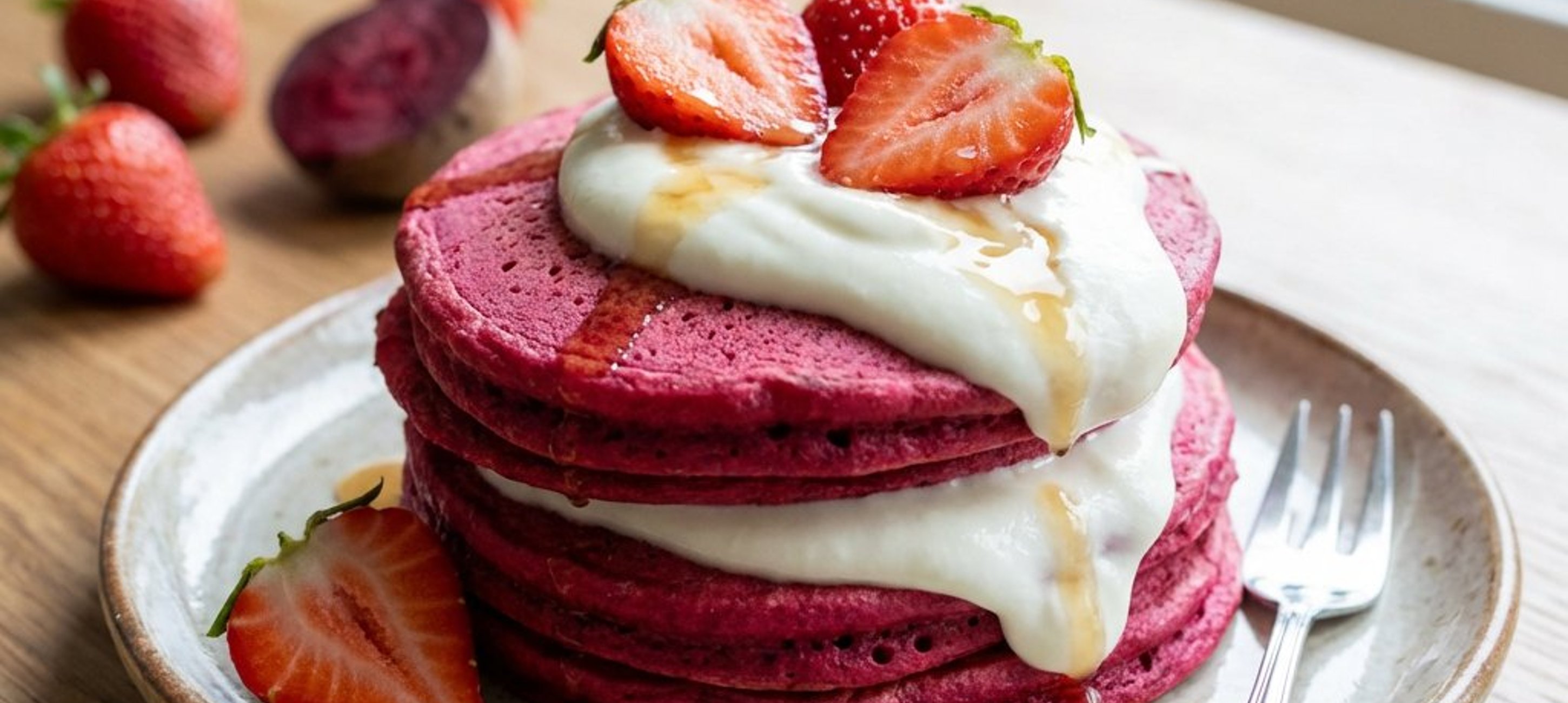 - 1Die gekochte Rote Bete in Würfel schneiden und in einen Standmixer geben. Eier, Milch, Rohrzucker, Salz und die Hälfte des Vanilleextrakts hinzufügen und mixen, bis eine glatte, leuchtend pinke Masse entsteht. Erst zum Schluss das Dinkelmehl unterrühren, bis ein homogener Teig entstanden ist.