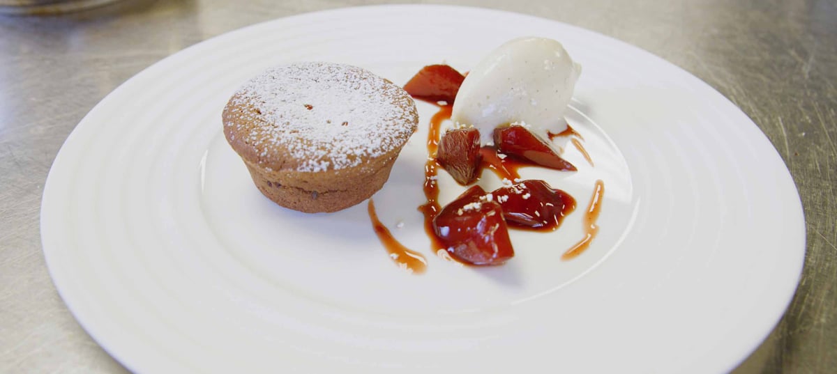 - 1Die Birnen dekorativ auf dem Teller verteilen, den Schokoladenkuchen mit seinem flüssigen Kern mit etwas Puderzucker bestreuen und in die Mitte stellen. Das Vanilleeis mit einem Eisportionierer oder einem Löffel in eine schöne Nocke abstechen und daneben platzieren.