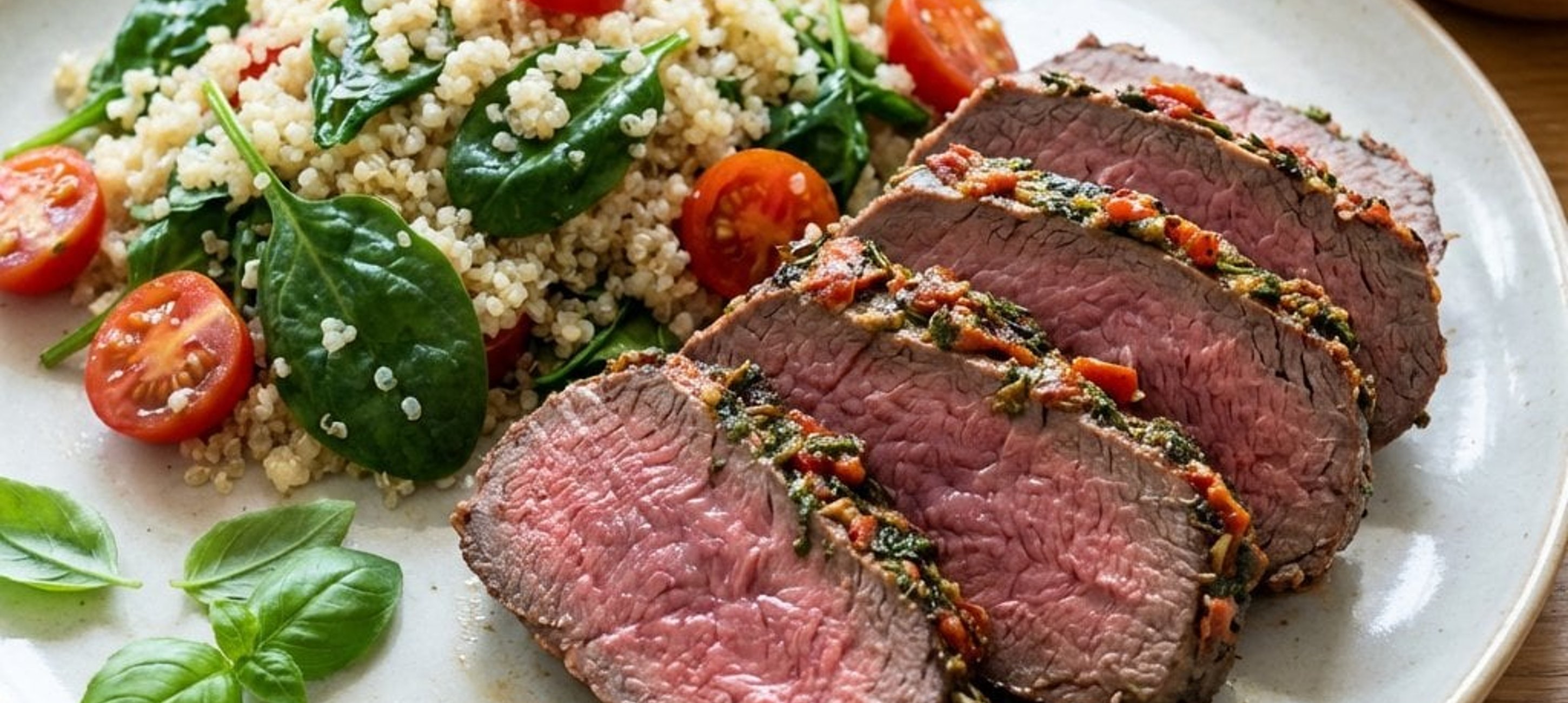 - 1Während das Fleisch ruht, die halbierten Kirschtomaten, den Babyspinat, Basilikum und Zitronensaft zur Quinoa in den Topf geben. Mit Salz und Pfeffer abschmecken und bei mittlerer Hitze 3–4 Minuten dünsten, bis der Spinat zusammengefallen ist. Das Steak aus der Folie nehmen, in Tranchen schneiden und zusammen mit der Spinat-Quinoa auf Tellern anrichten.