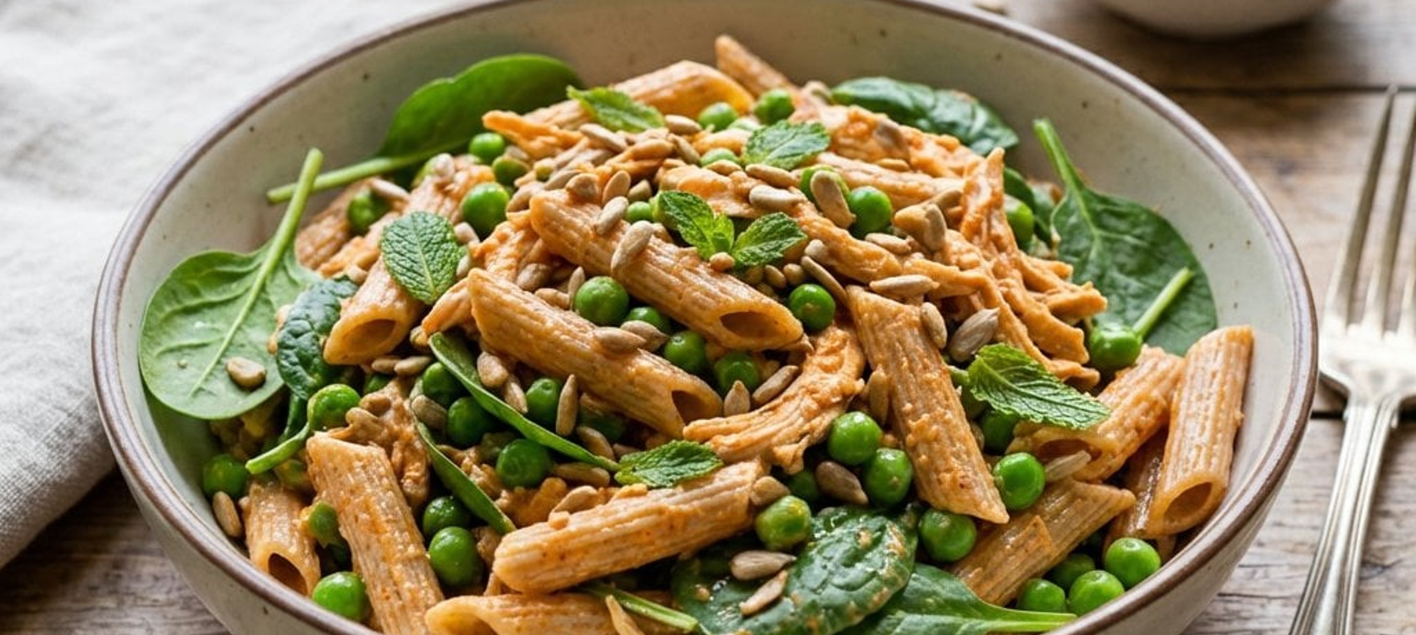 - 2In der Zwischenzeit das Dressing zubereiten. Die aufgetauten Erbsen, den Babyspinat, Joghurt, Paprikapulver, Chiliflocken, Zitronensaft, die fein gehackte Minze und 20 g der Sonnenblumenkerne in ein hohes Gefäß geben. Alles mit einem Stabmixer glatt pürieren. Mit Salz und Pfeffer abschmecken.