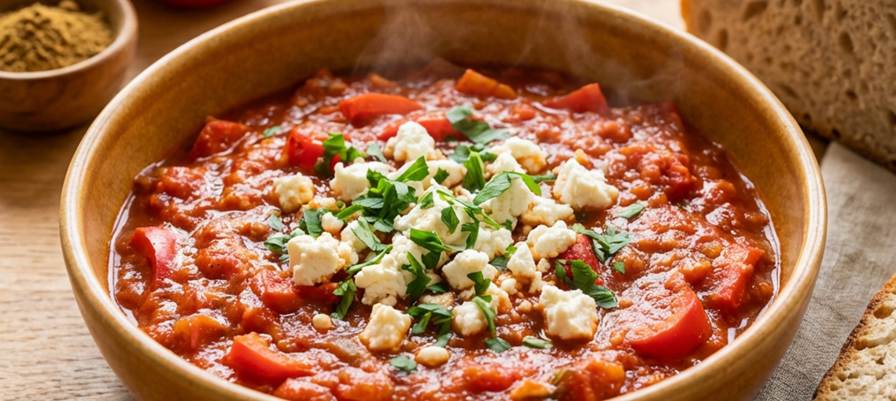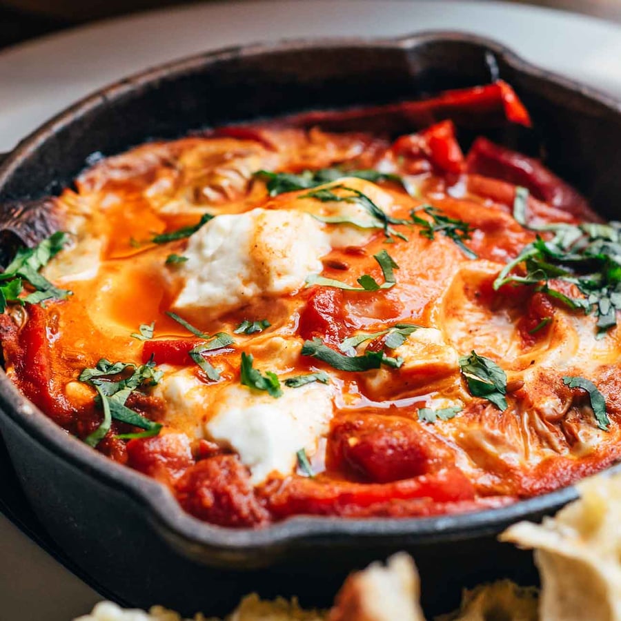 - 5Nimm das Shakshuka vom Herd und topp es mit “Feta”, Petersilie und einem Schuss Olivenöl. Serviere es mit frischem Brot.