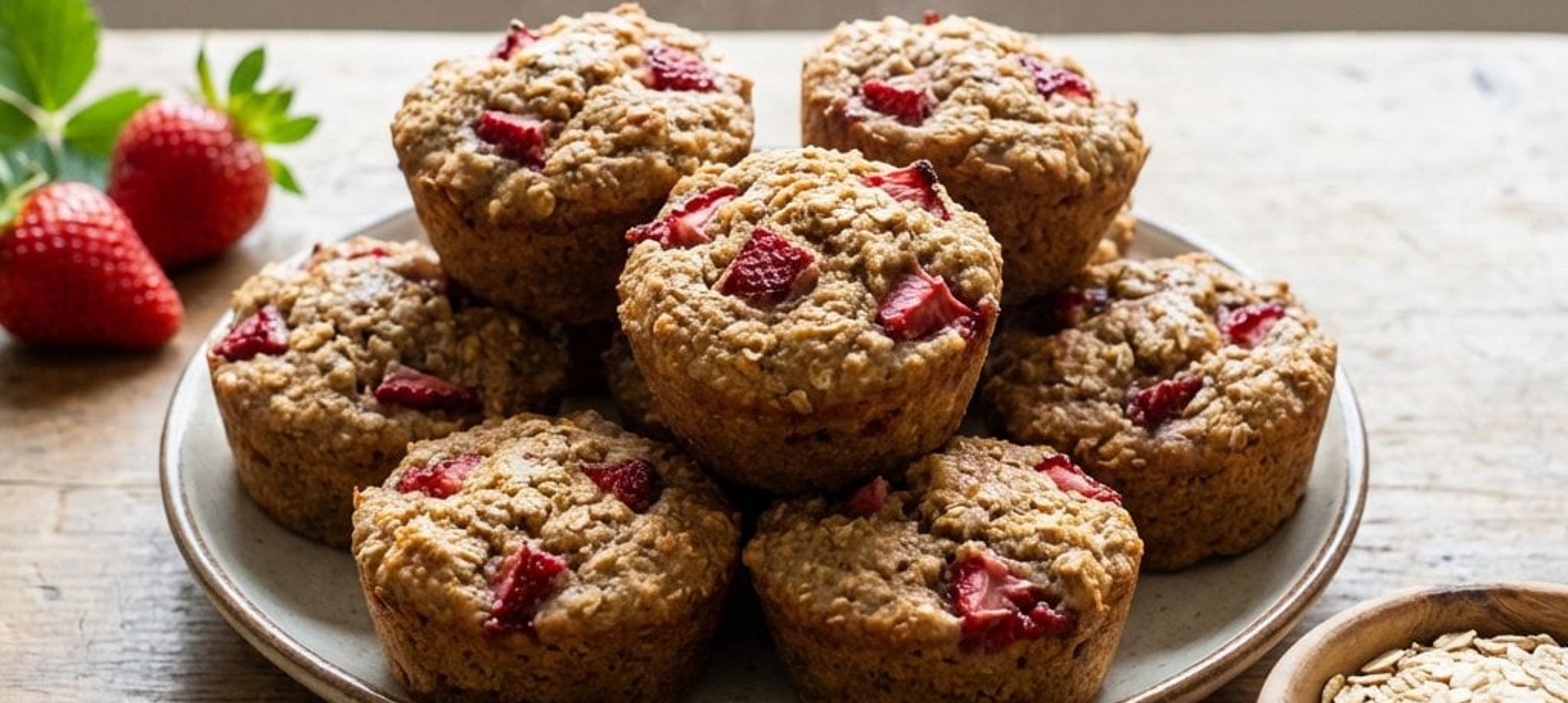 - 2In einer großen Schüssel Haferflocken, Dinkelvollkornmehl, Eier, Zucker, Wasser, Backpulver und Vanilleextrakt zu einem glatten Teig verrühren. Die Erdbeeren waschen, putzen, in kleine Würfel schneiden und vorsichtig unter den Teig heben.