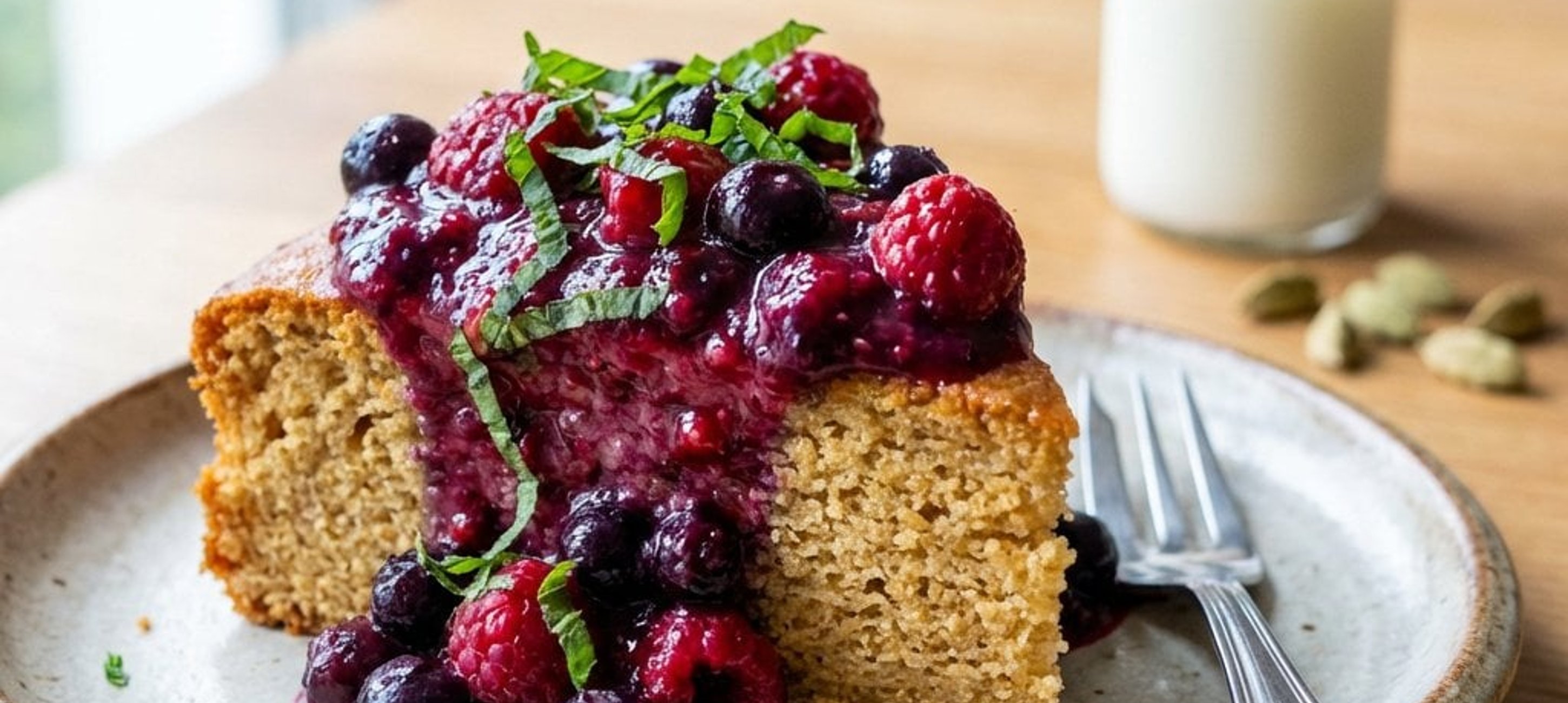 - 3Den fertigen Kuchen aus dem Ofen nehmen und mindestens 30 Minuten abkühlen lassen. Vor dem Servieren mit dem warmen Waldbeeren-Kompott übergießen. Nach Belieben mit frischer Minze garnieren.