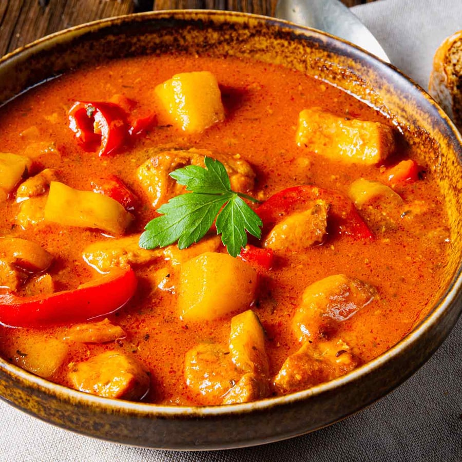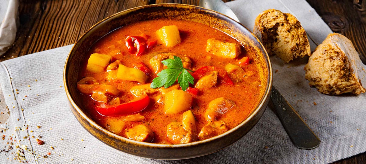 - 3Paprikapulver, Tomatenmark und Paprikastreifen hinzufügen. Zuletzt Gemüsebrühe und passierte Tomaten einrühren und den Eintopf etwa 10–15 Minuten bei mittlerer Hitze köcheln lassen, bis das Gemüse weich ist.