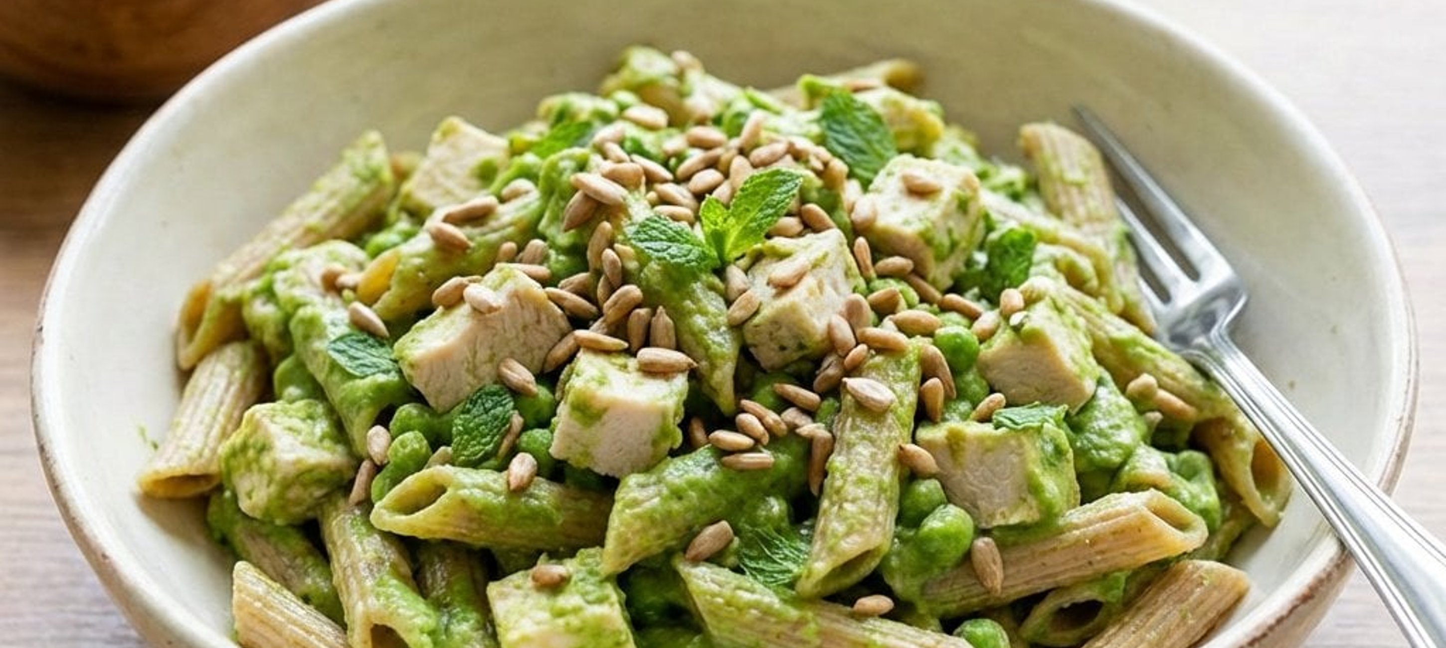- 3Die abgekühlten Nudeln in eine große Schüssel geben. Die gewürfelte, gekochte Hähnchenbrust und das grüne Dressing hinzufügen.