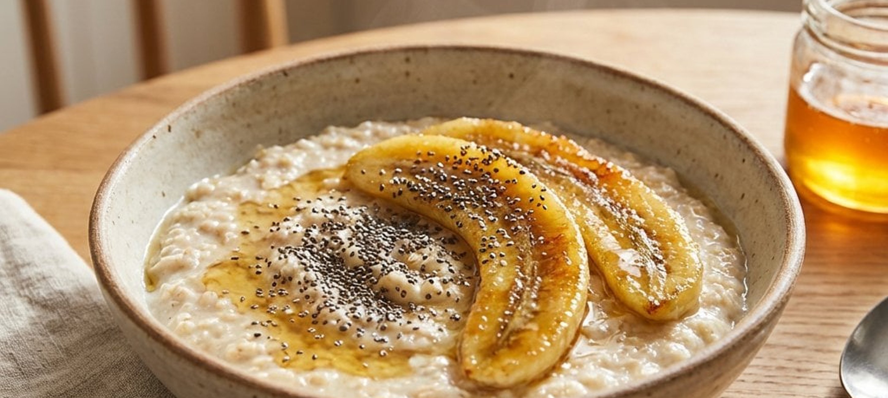 - 3Verteilen Sie den fertigen Haferbrei auf zwei Schüsseln und servieren Sie jede Portion mit den warmen, karamellisierten Bananenstücken.