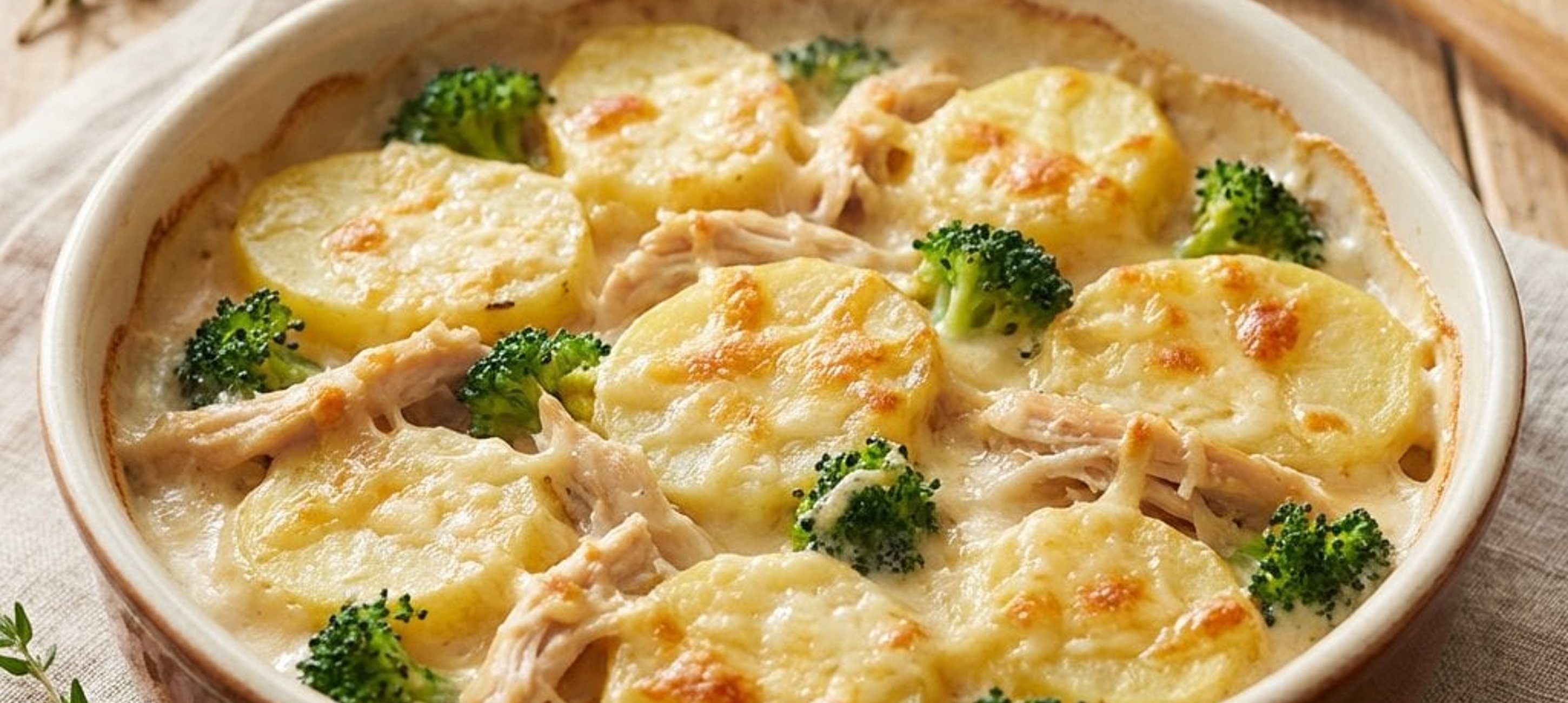 - 2Die Kartoffeln gründlich waschen, abtrocknen und in feine Scheiben schneiden. Das Hähnchenbrustfilet in mundgerechte Stücke schneiden (oder gezupftes, vorgekochtes Fleisch verwenden). Den Brokkoli fein hacken. Kartoffeln, Fleisch und Brokkoli in die Schüssel geben.