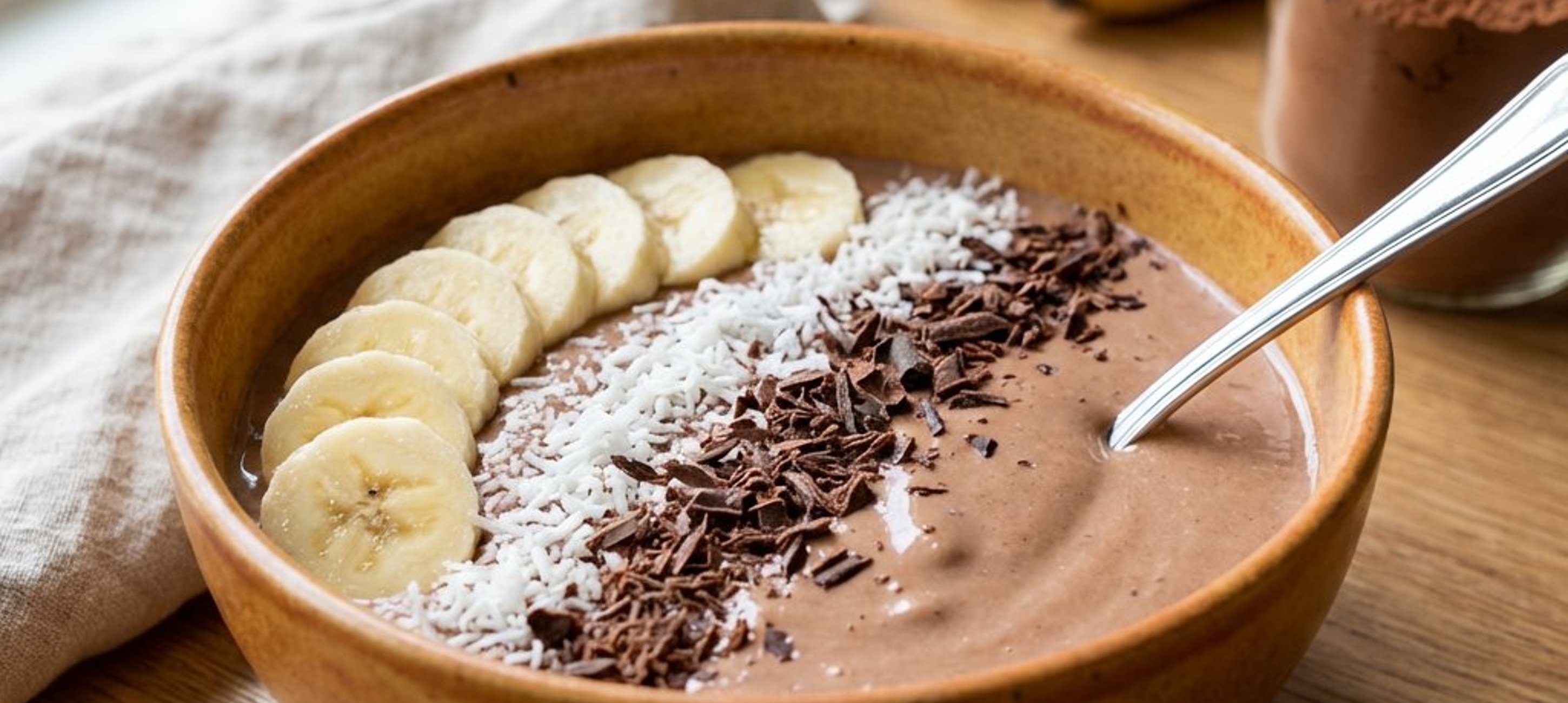 - 3Die verbliebene Banane in Scheiben schneiden. Die Smoothie-Bowl zuerst mit den Kokosraspeln und der fein gehackten Zartbitterschokolade bestreuen. Dann die frischen Bananenscheiben darauf anrichten. Zum Schluss den restlichen Teelöffel Erdnussbutter darüber träufeln und die Bowl sofort genießen.