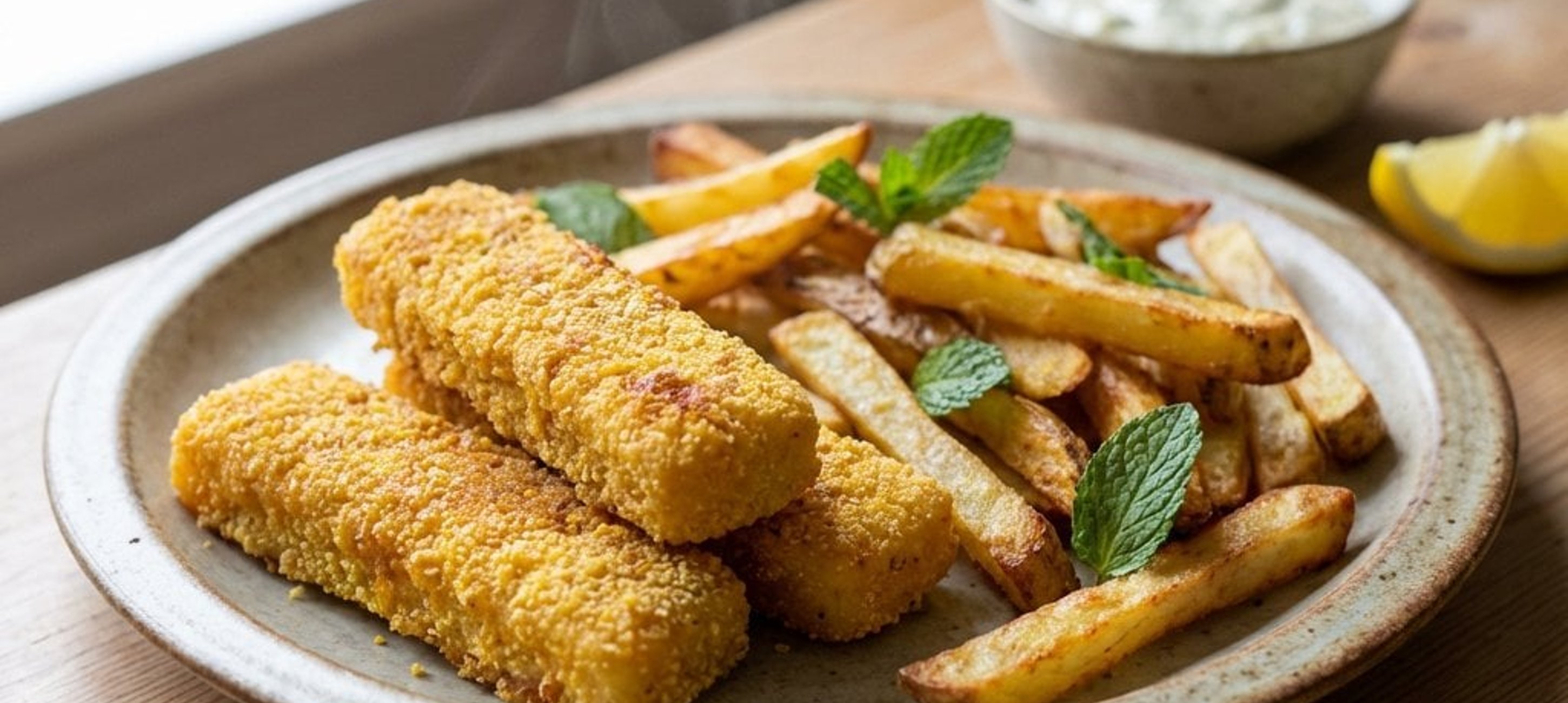 - 1Die fertigen Pommes mit fein gehackter Minze bestreuen. Die Fischstäbchen vor dem Servieren mit etwas frischem Limettensaft beträufeln und zusammen mit den Minz-Pommes genießen.