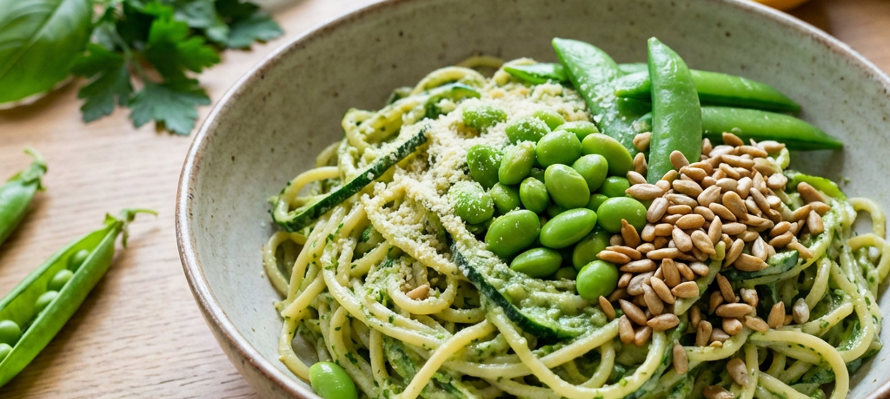 - 5Nachdem die Nudeln gekocht sind, die grüne Sauce und das Gemüse zu den Nudeln geben und gründlich vermengen. Mit den gerösteten Sonnenblumenkernen, frischen Kräutern und veganem Parmesan servieren.