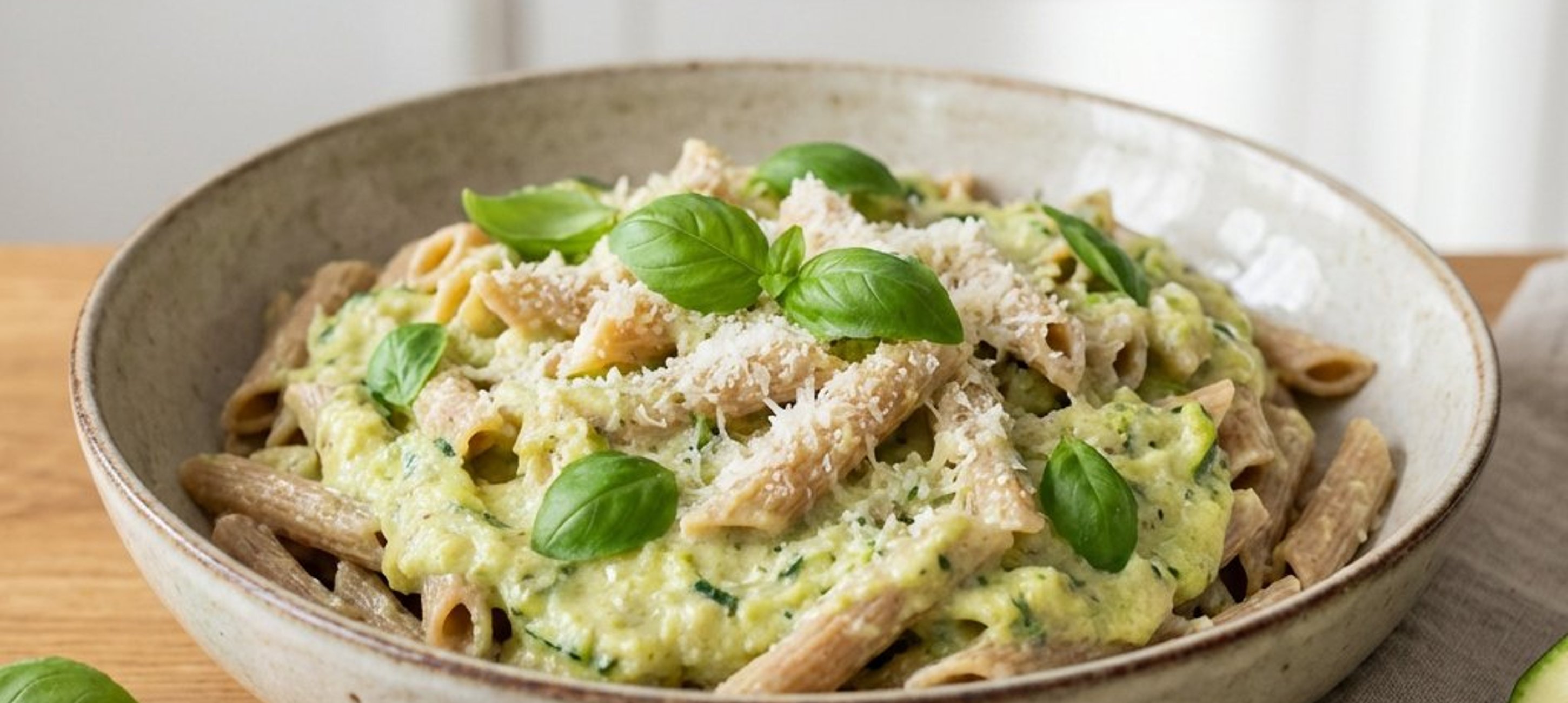 - 3Die gekochte Pasta abgießen. Den Parmesan fein reiben. Sobald die Zucchini in der Pfanne weich ist, die Mischung in ein hohes Mixgefäß geben. Die Sahne, den geriebenen Parmesan und das frische Basilikum hinzufügen und alles mit einem Stabmixer glatt pürieren. Die Sauce zurück in die Pfanne geben, die abgetropften Nudeln hinzufügen und alles gut vermengen. Mit Salz und Pfeffer abschmecken.