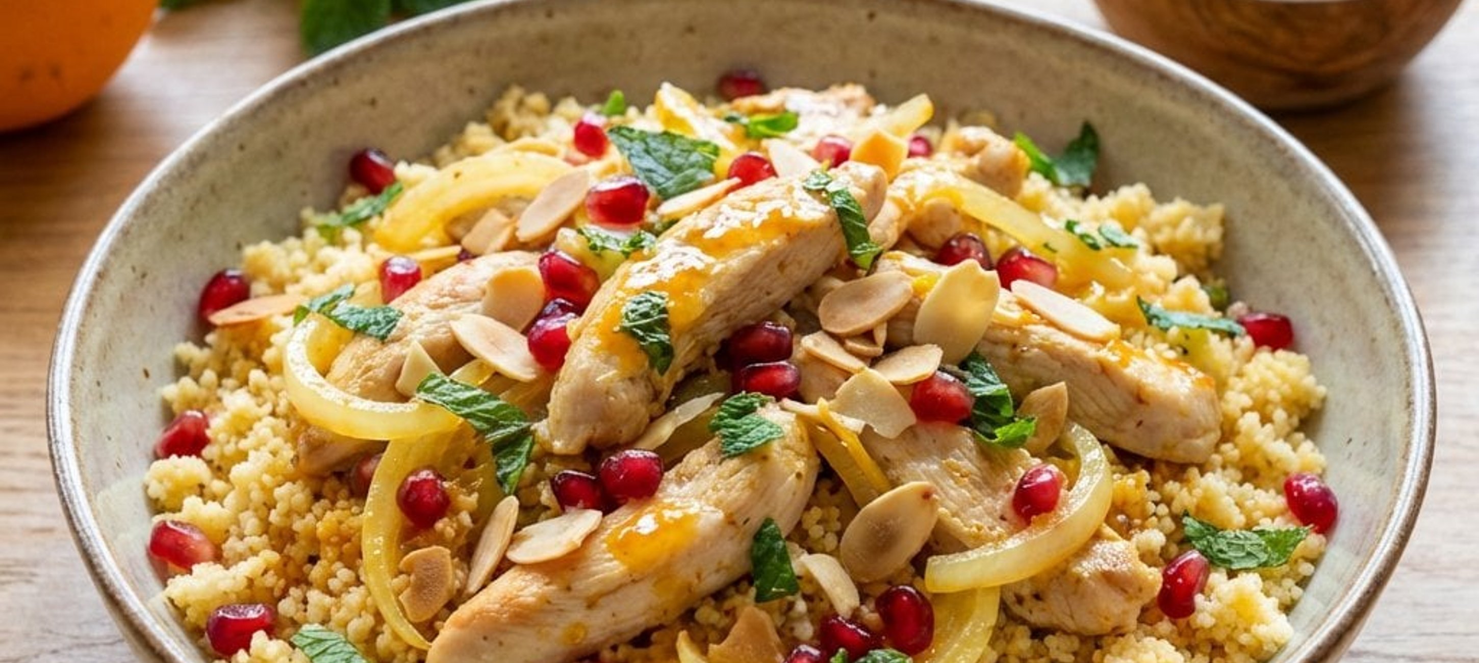 - 4Zum Schluss die Fleischmischung zum Couscous in die Schüssel geben, alles gut vermengen und auf Teller verteilen. Jede Portion mit frischer Minze, Mandelblättchen und Granatapfelkernen bestreuen und servieren.