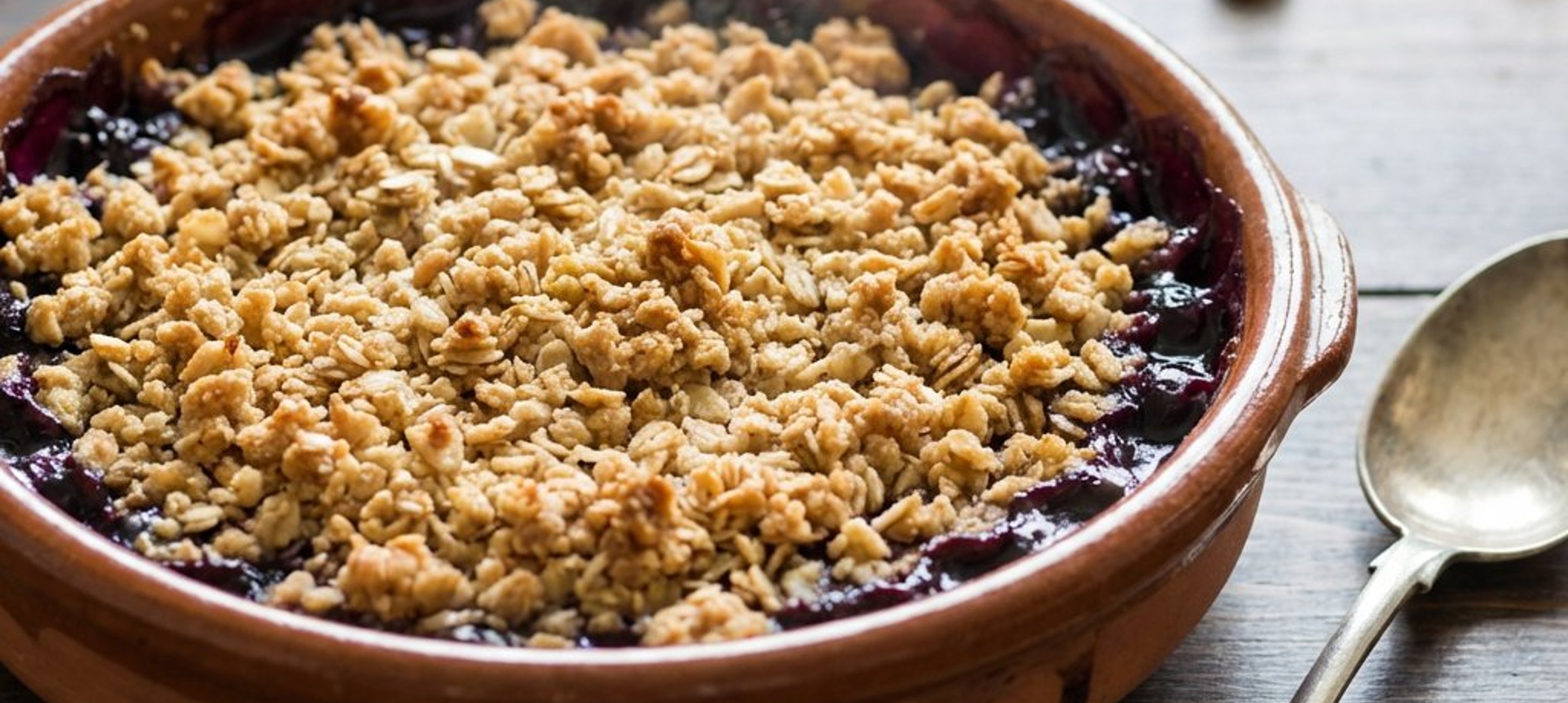 - 1Die gefrorenen Heidelbeeren direkt in die Auflaufform geben, mit der Maisstärke bestreuen und vorsichtig vermischen. Die vorbereitete Haferflocken-Mischung gleichmäßig über den Beeren verteilen, sodass diese vollständig bedeckt sind.