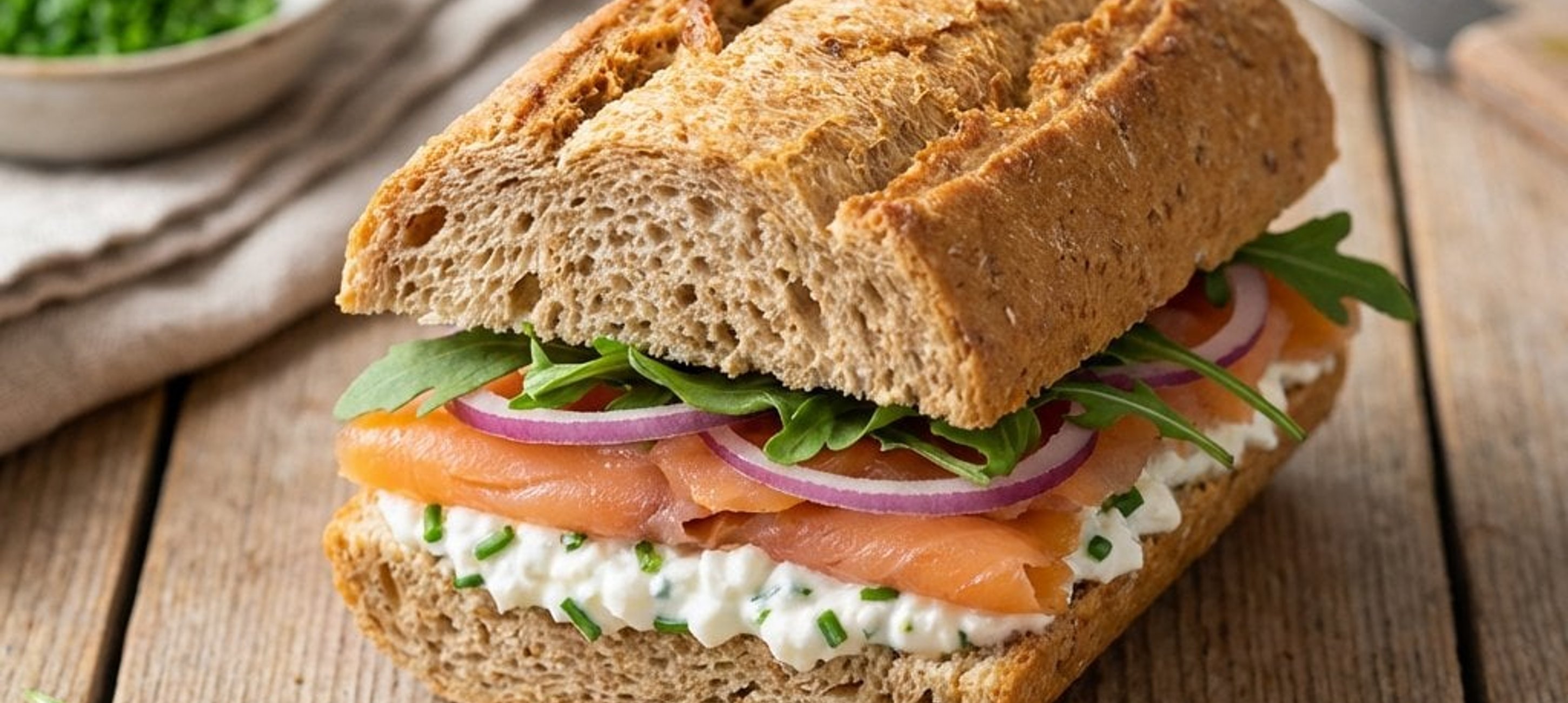 - 3Die Hüttenkäse-Mischung großzügig auf die untere Baguettehälfte streichen. Darauf den Räucherlachs, die roten Zwiebelringe und den Rucola verteilen. Mit der oberen Baguettehälfte abdecken und sofort genießen.