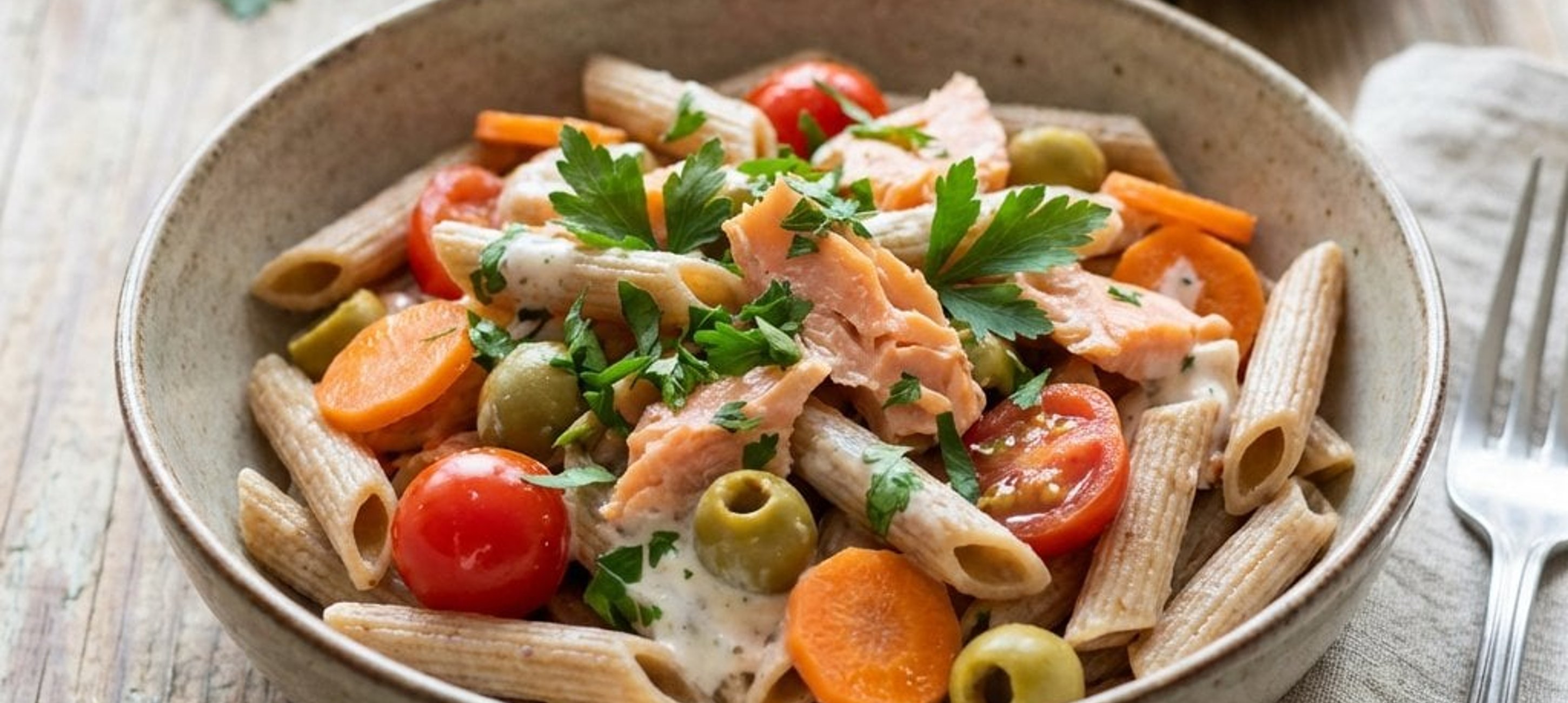 - 2Während die Pasta kocht, die Karotten schälen und in feine Scheiben schneiden. Die Kirschtomaten und Oliven halbieren. Den Räucherlachs in mundgerechte Stücke schneiden.
