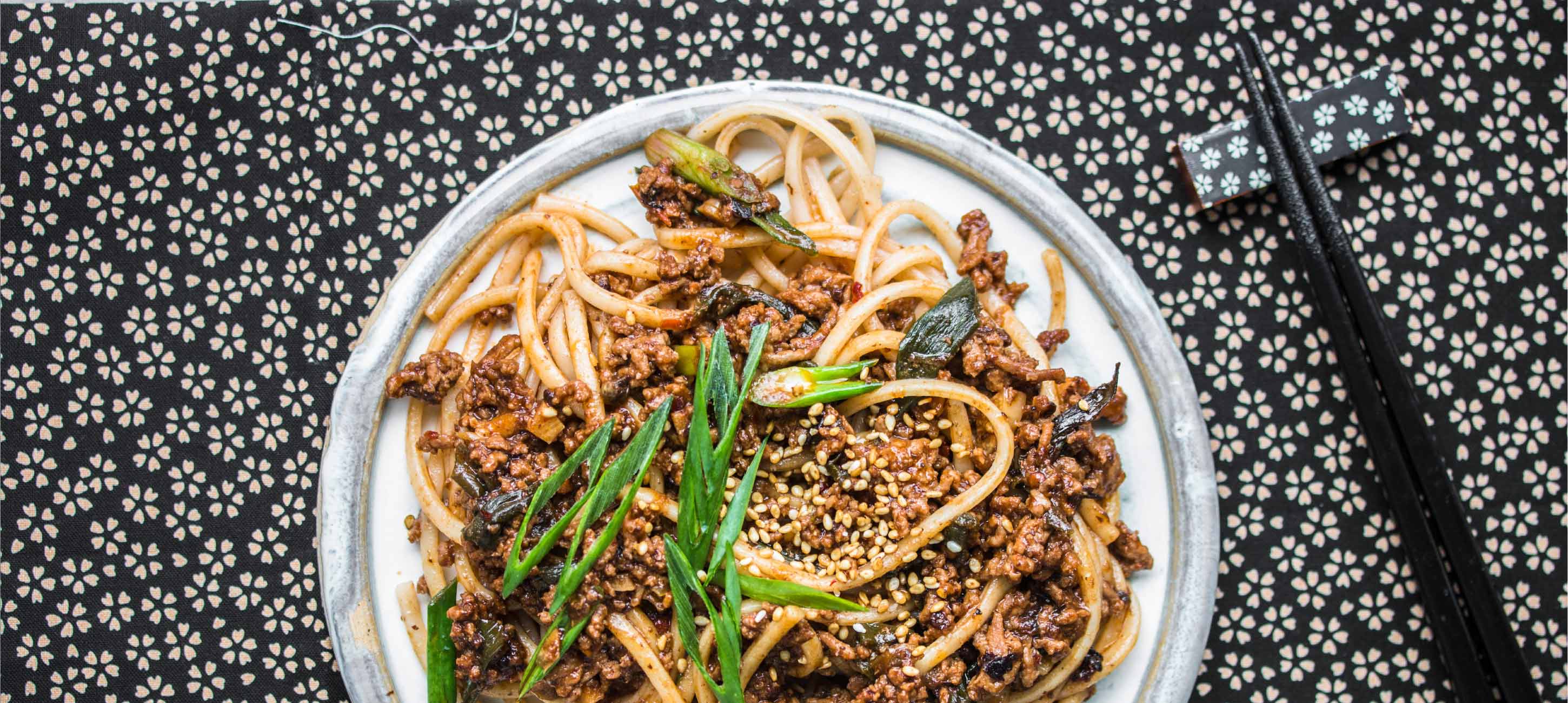 - 5Auf dem Teller verteilen und mit etwas feingeschnittenem Grün der letzten Frühlingszwiebel und den Sesamkörnern bestreuen.