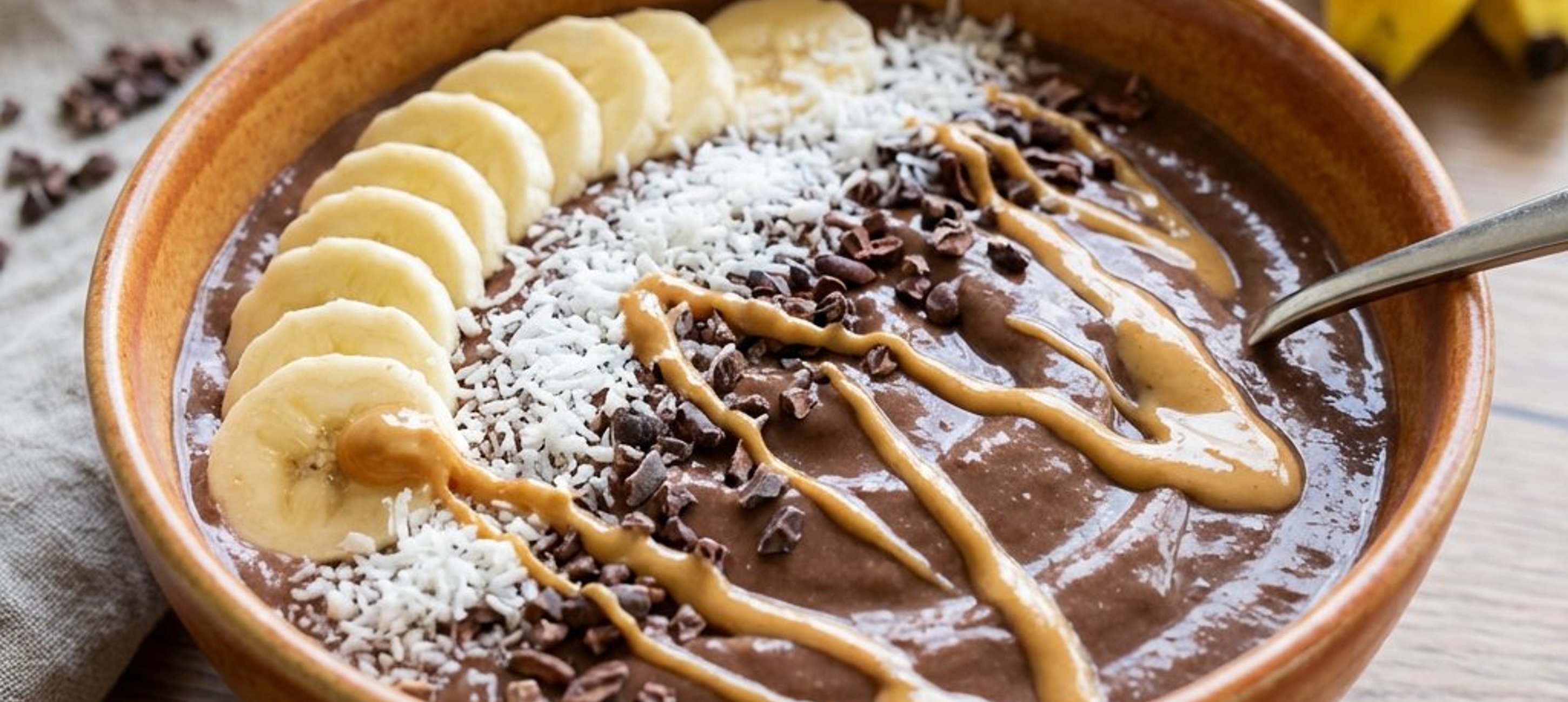 - 2Die beiseitegelegte Banane in Scheiben schneiden. Die Smoothie-Bowl zuerst mit Kokosraspeln und gehackter Zartbitterschokolade bestreuen. Dann die frischen Bananenscheiben darauf anrichten. Zum Schluss mit dem restlichen Teelöffel Erdnussbutter beträufeln und sofort genießen.