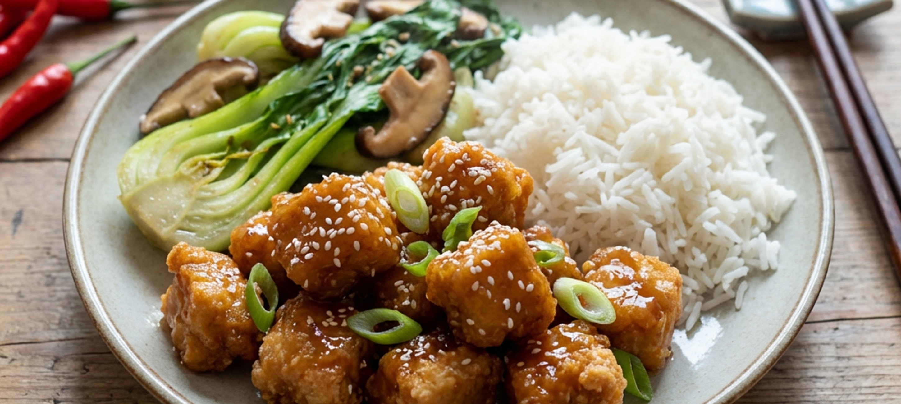 - 8Auf einem Teller Reis, Pak Choi und Hähnchen anrichten. Mit Frühlingszwiebeln und Sesam garnieren.
