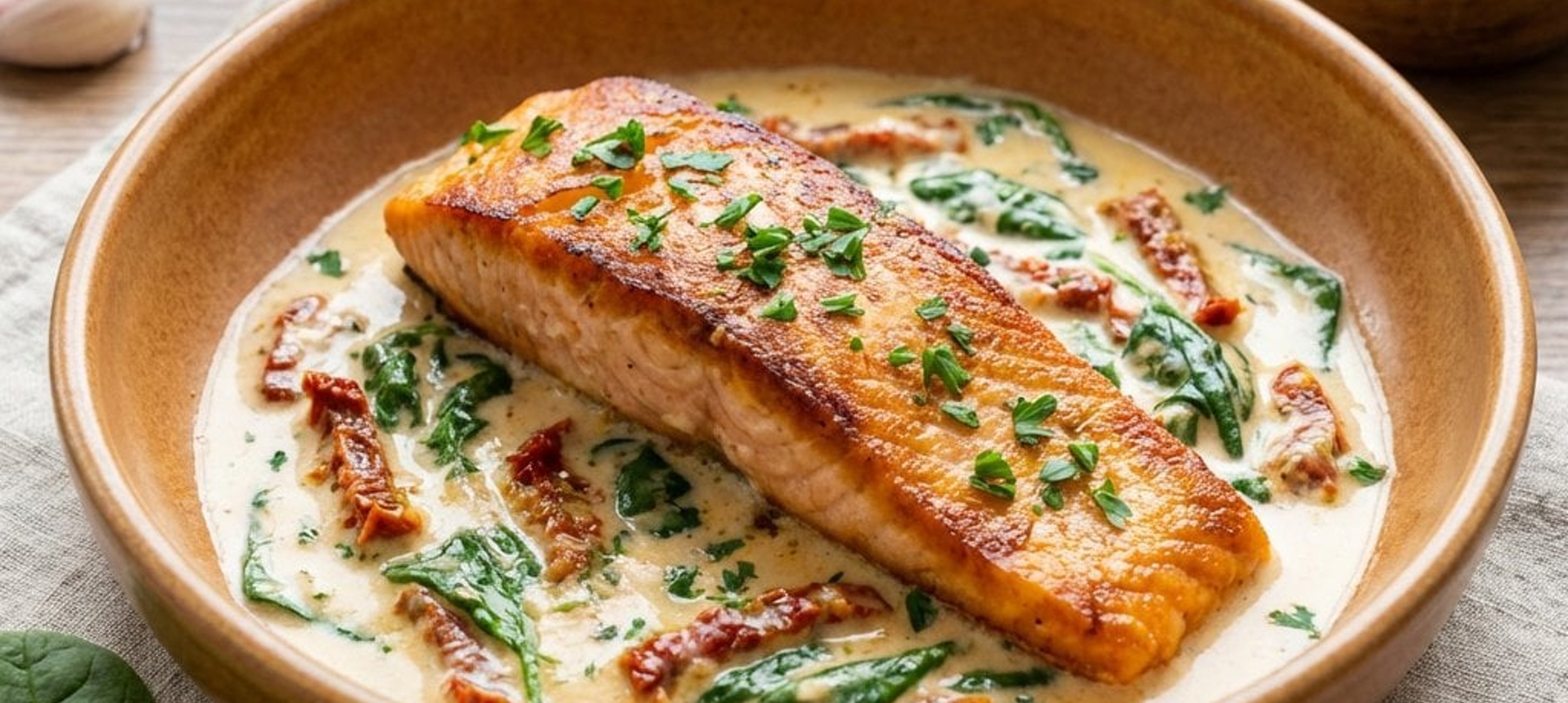 - 3Butter in dieselbe Pfanne geben und die Zwiebel, den Knoblauch sowie die getrockneten Tomaten darin 1–2 Minuten glasig dünsten. Mit Kokosmilch aufgießen, den geriebenen Parmesan hinzufügen und gut verrühren. Den Lachs zurück in die Pfanne geben und alles 4–5 Minuten bei schwacher Hitze köcheln lassen. In der Zwischenzeit die Petersilie fein hacken.