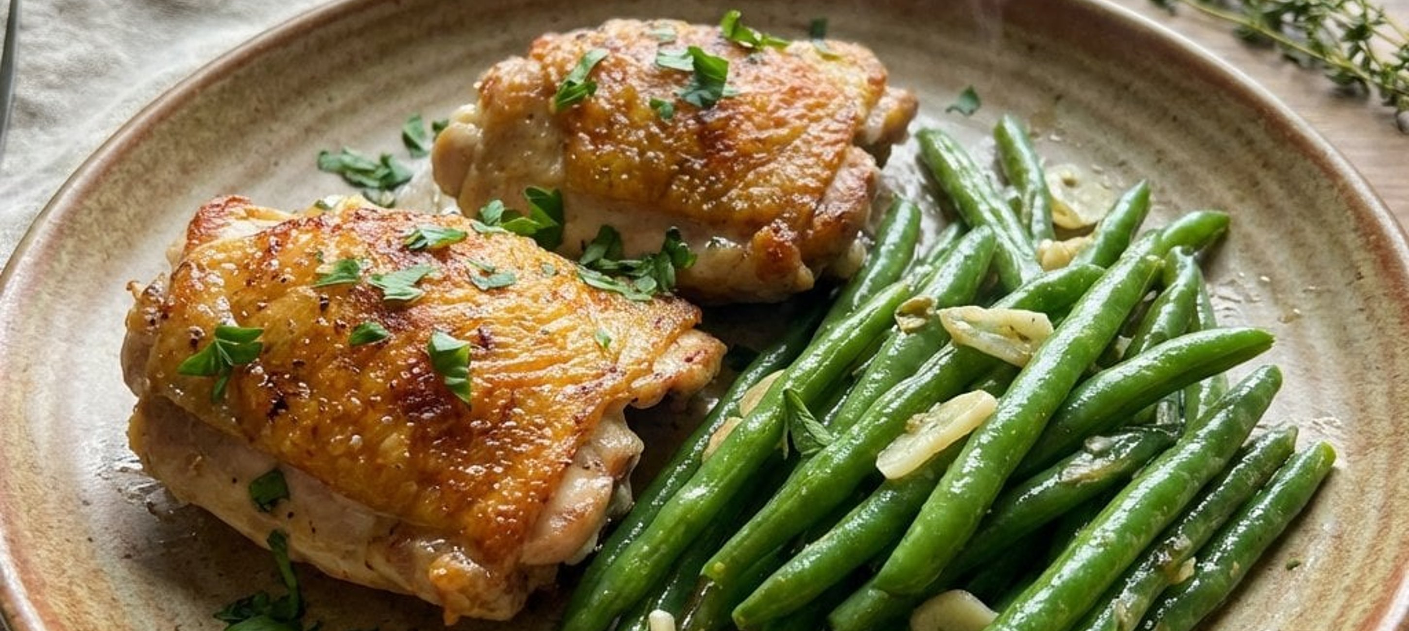 - 3Das fertig gebratene Hähnchen aus der Pfanne nehmen und beiseitestellen. Die Hitze auf niedrige Stufe reduzieren. Bohnen und das restliche Rapsöl in die Pfanne geben und 3–4 Minuten anbraten. Butter, gepressten Knoblauch, Salz und Pfeffer hinzufügen und weitere 1–2 Minuten braten. Gehackte Petersilie und Chiliflocken unterrühren und 30–60 Sekunden mitgaren. Das Hähnchen zurück in die Pfanne geben, kurz erwärmen und sofort servieren.