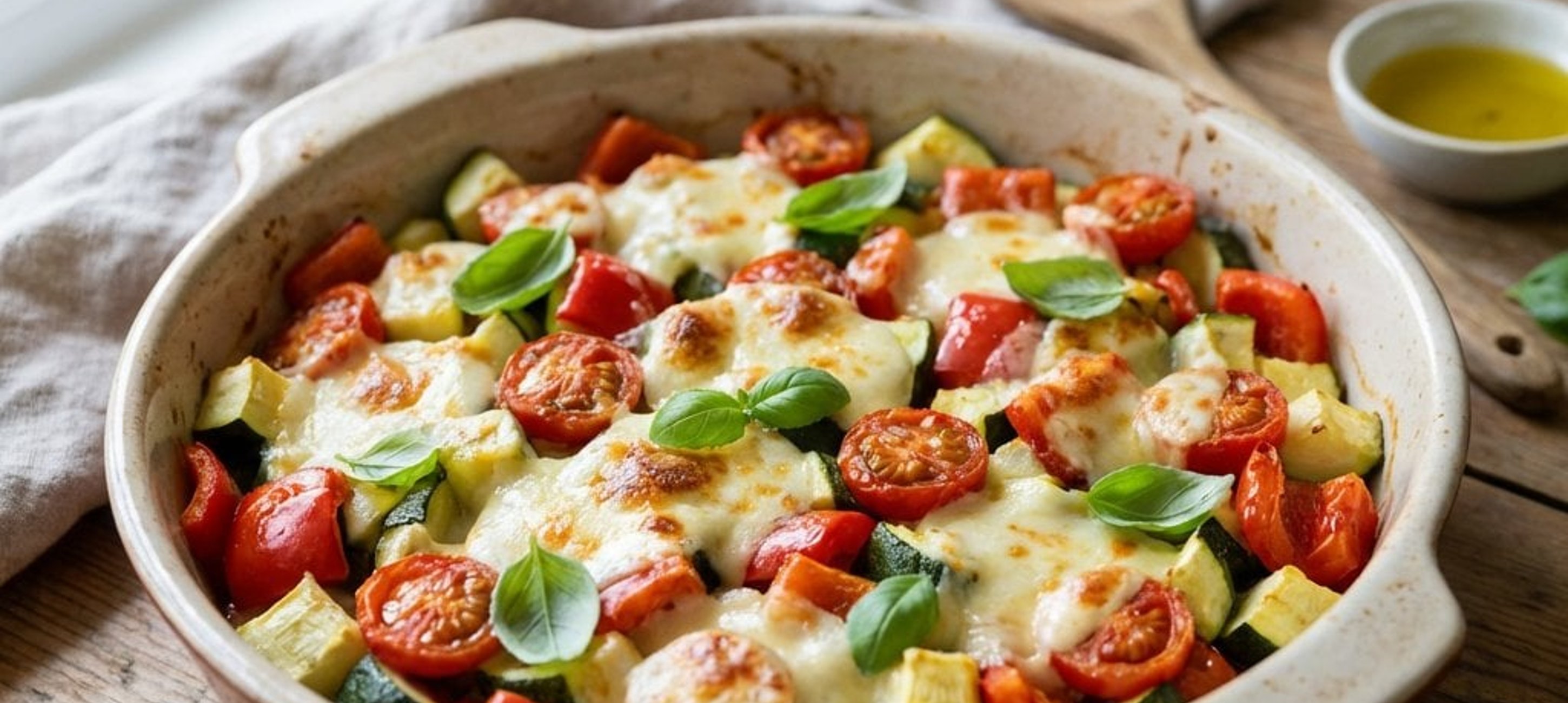 - 1Die Auflaufform kurz aus dem Ofen nehmen. Den Mozzarella grob reiben oder in kleine Stücke zupfen und gleichmäßig über dem Gemüse verteilen. Zurück in den Ofen geben und weitere 10–15 Minuten backen, bis der Käse geschmolzen und leicht goldbraun ist.