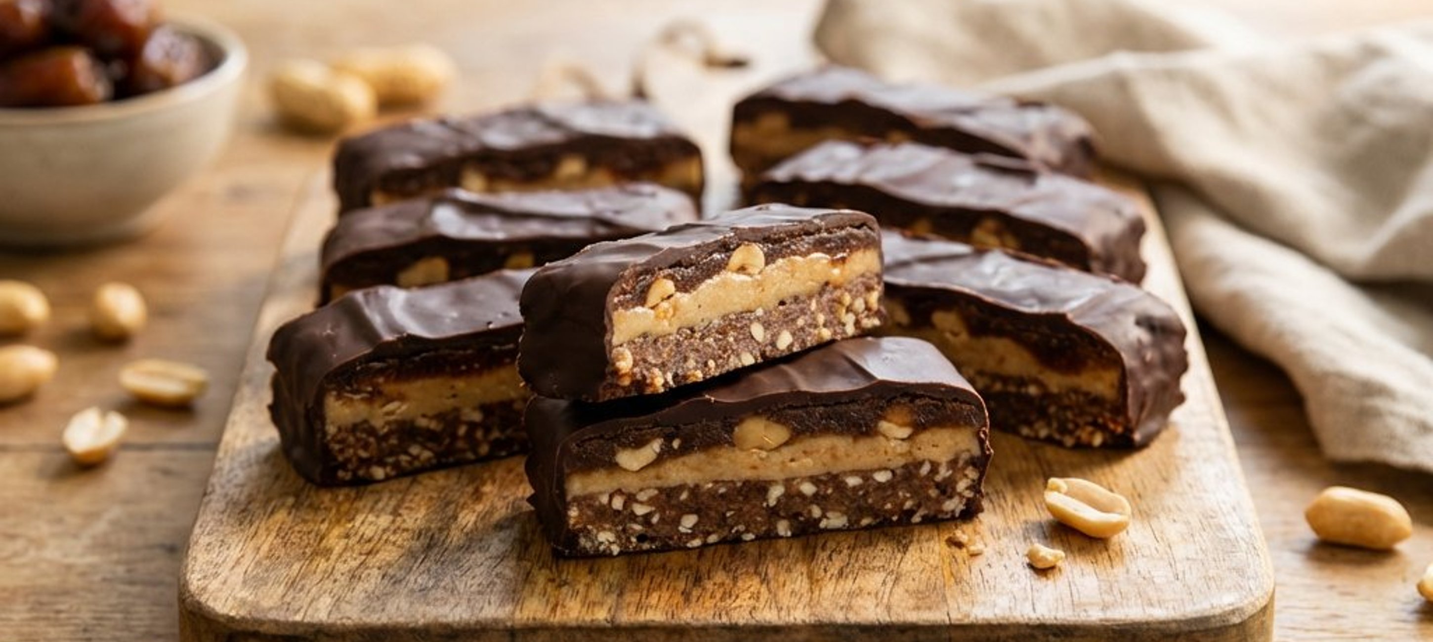 - 2Sobald die Masse in der Form fest ist, nehmen Sie sie heraus und schneiden sie in 6 gleich große Riegel. Tauchen Sie jeden Riegel in die geschmolzene Schokolade, sodass er vollständig überzogen ist. Lassen Sie die Riegel für mindestens 10 Minuten im Kühlschrank fest werden, bevor Sie sie servieren.