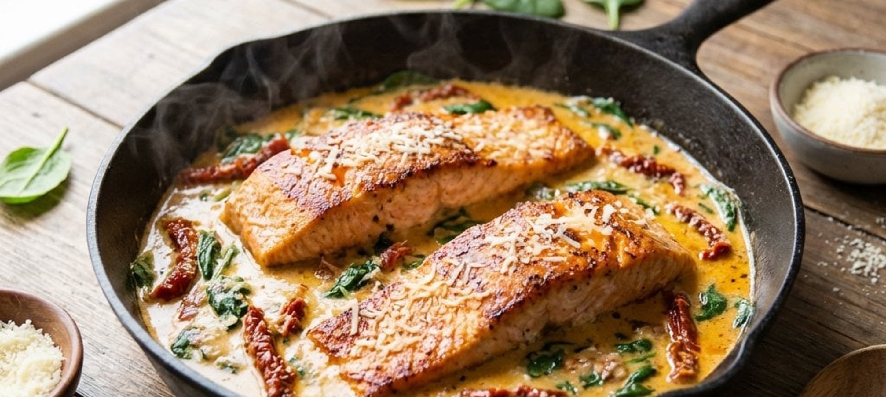 - 1In derselben Pfanne nun die Butter schmelzen. Die gehackte Zwiebel, den Knoblauch und die getrockneten Tomaten hinzufügen und 1–2 Minuten bei niedriger Hitze andünsten. Die Mischung mit Kokosmilch aufgießen, den geriebenen Parmesan hinzufügen und gut verrühren. Den Lachs zurück in die Pfanne geben und alles 4–5 Minuten bei schwacher Hitze köcheln lassen. In der Zwischenzeit die Petersilie fein hacken. Zum Schluss den Babyspinat und die gehackte Petersilie unterrühren, noch 1 Minute mitgaren, bis der Spinat zusammengefallen ist. Von der Kochstelle nehmen und servieren.
