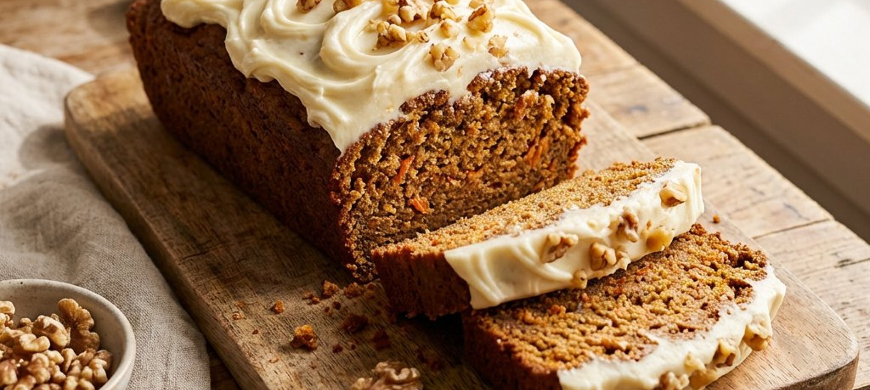 - 4Für das Frosting in einer kleinen Schüssel den Frischkäse mit der weichen Butter, dem restlichen Honig (40 g) und dem restlichen Vanilleextrakt (1 TL) zu einer glatten, dicken Creme verrühren. Die Creme gleichmäßig auf dem abgekühlten Brot verteilen. Das Karottenbrot für mindestens 45 Minuten im Kühlschrank ziehen lassen. Vor dem Servieren in Scheiben schneiden und genießen.
