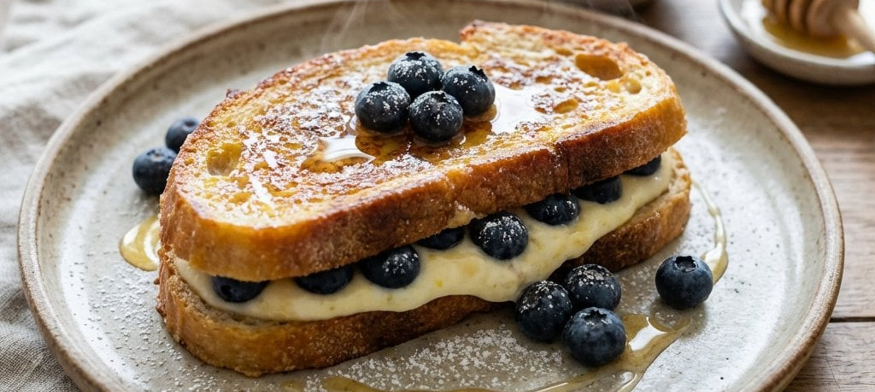 - 3Das eingeweichte Brot vorsichtig mit der Quarkmischung füllen. Butter in einer Pfanne bei mittlerer Hitze schmelzen. Die gefüllten Toasts darin von jeder Seite 4–5 Minuten goldbraun anbraten. Sofort servieren. Übrig gebliebene Füllung kann als Topping verwendet werden.