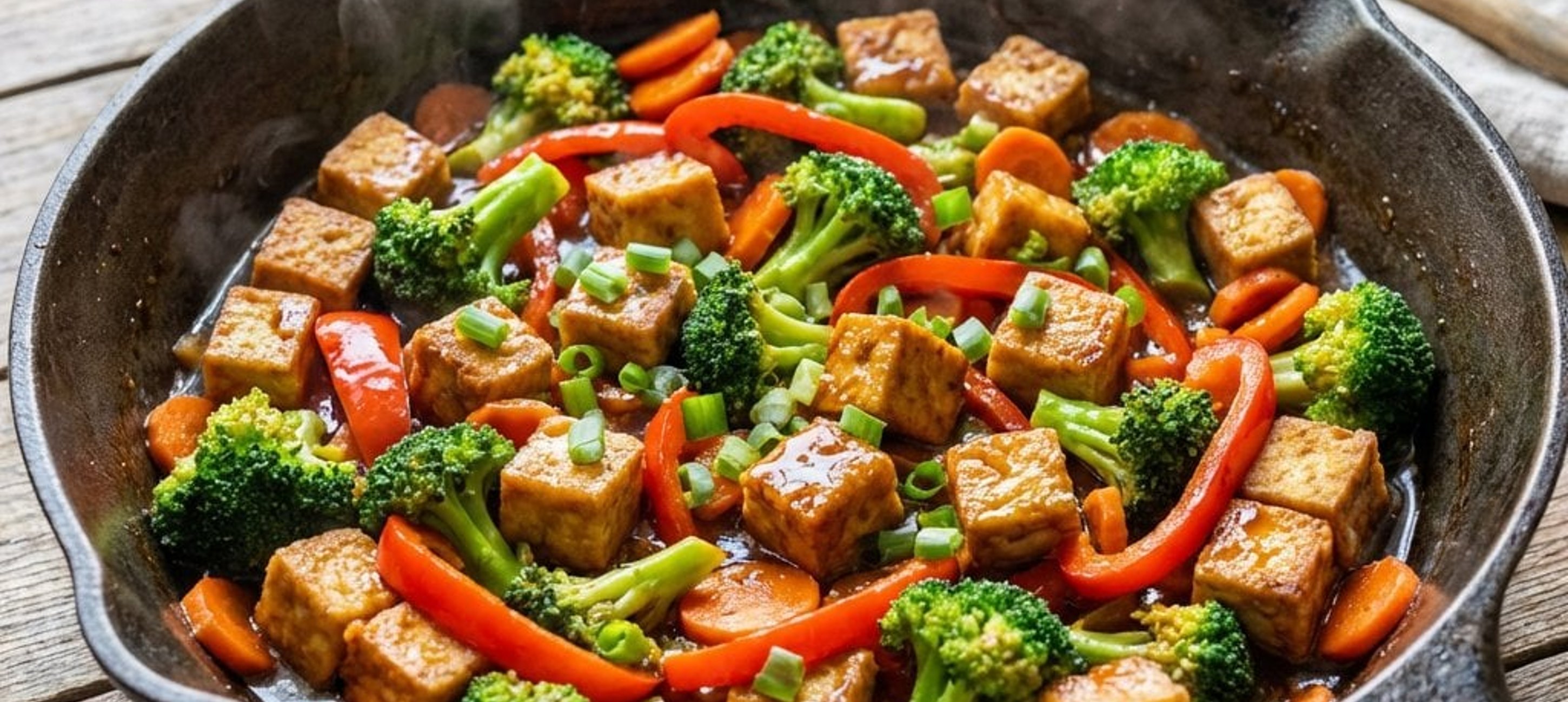- 1In derselben Pfanne Knoblauch, Ingwer und Karotten 2–3 Minuten anbraten. Brokkoli, Paprika, Frühlingszwiebeln und gefrorene Bohnen hinzufügen und weitere 2–3 Minuten braten. Den Tofu zurück in die Pfanne geben. Sauce nochmals umrühren, dazugießen und unter Rühren 2–3 Minuten köcheln lassen, bis sie eindickt. Final abschmecken und servieren. Dazu passt Reis.