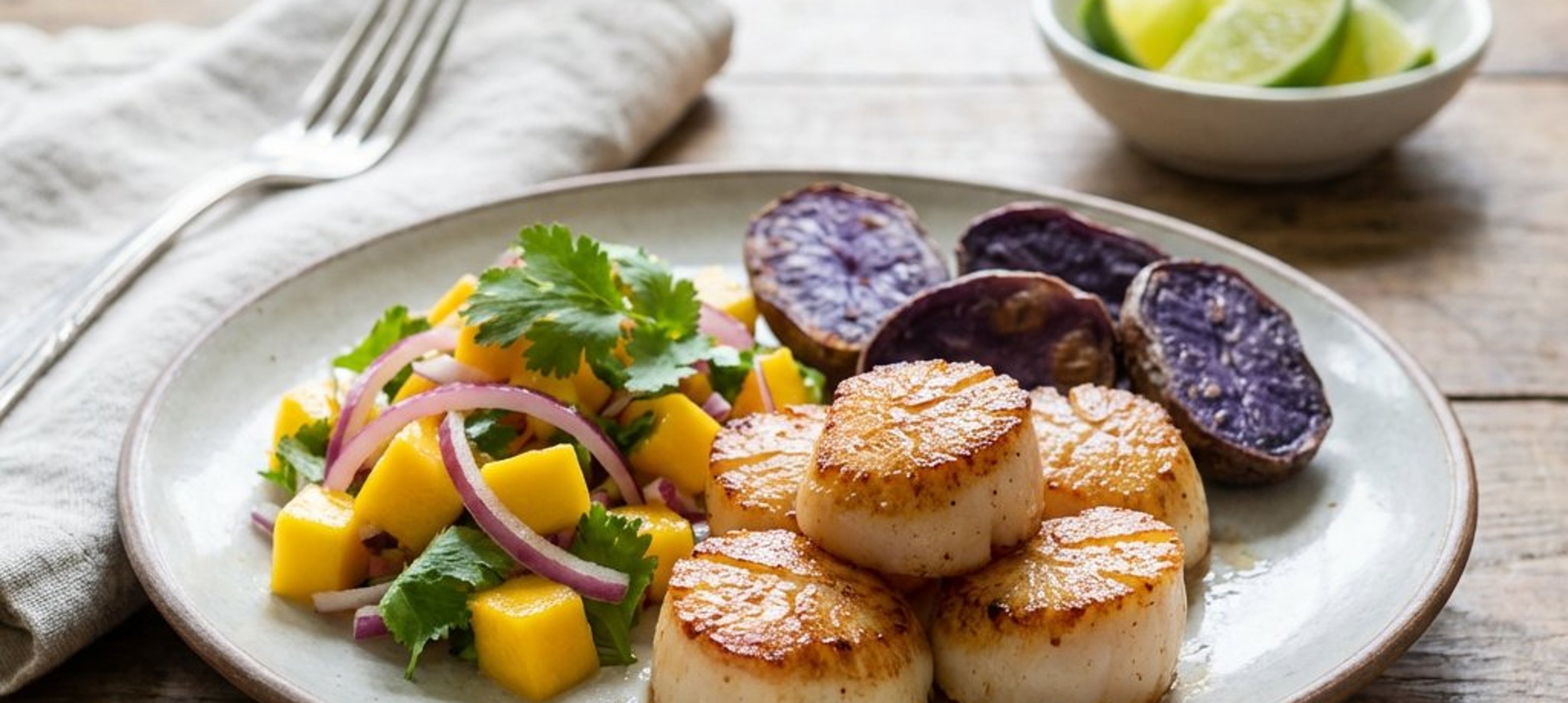 - 4Die gebratenen lila Kartoffeln auf Tellern anrichten, die Jakobsmuscheln darauf platzieren und mit dem Mangosalat ergänzen. Mit etwas Limettenabrieb garnieren und sofort servieren.