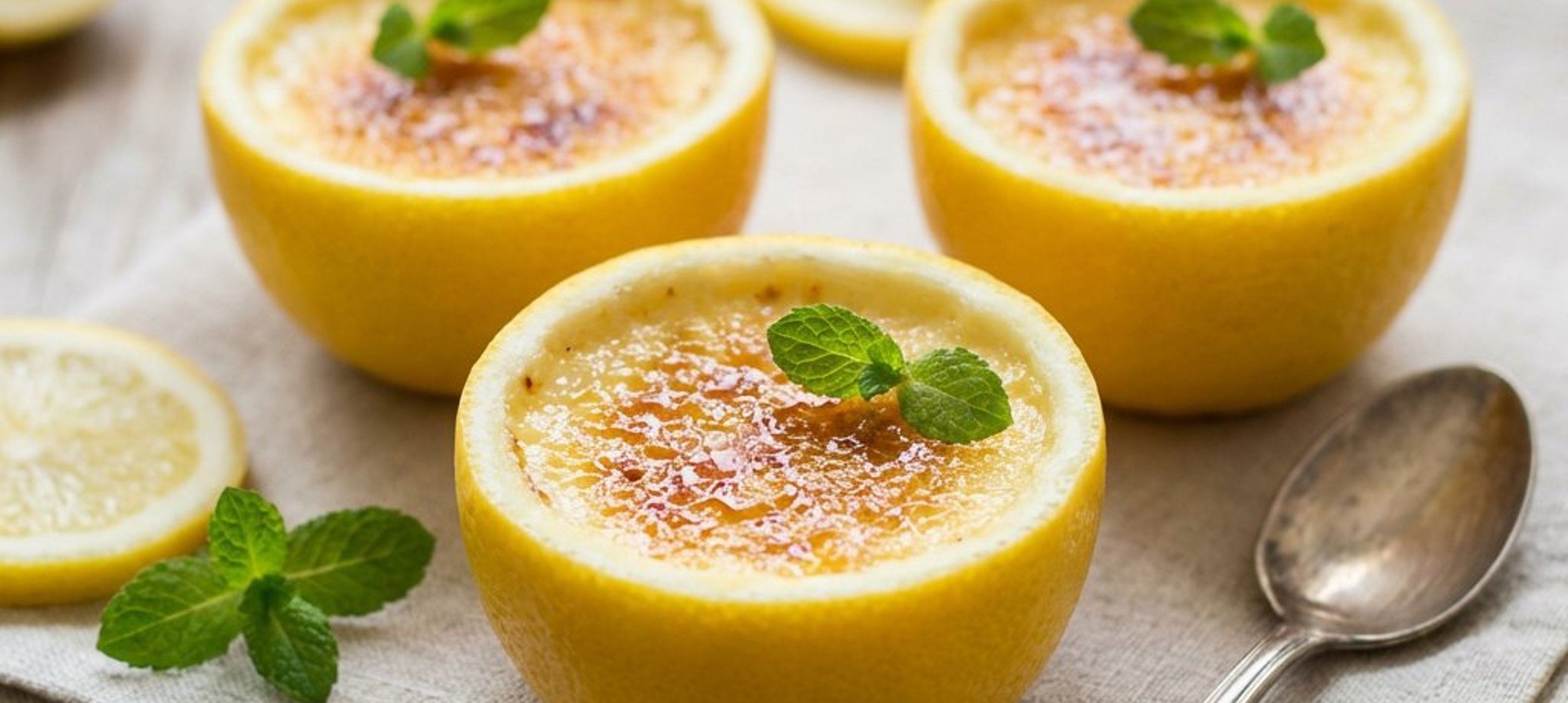 - 1Die Auflaufform aus dem Ofen nehmen und die vorbereitete Creme bis knapp unter den Rand in die Zitronenhälften füllen. Bei 150 °C ca. 25–35 Minuten backen, bis die Creme fest ist, aber in der Mitte noch leicht wackelt. Wichtig: Das Backen im Wasserbad verhindert ein Überhitzen und Gerinnen der Creme. Nicht zu lange backen – die Crème Brûlée soll oben fest, aber innen zart-cremig sein.